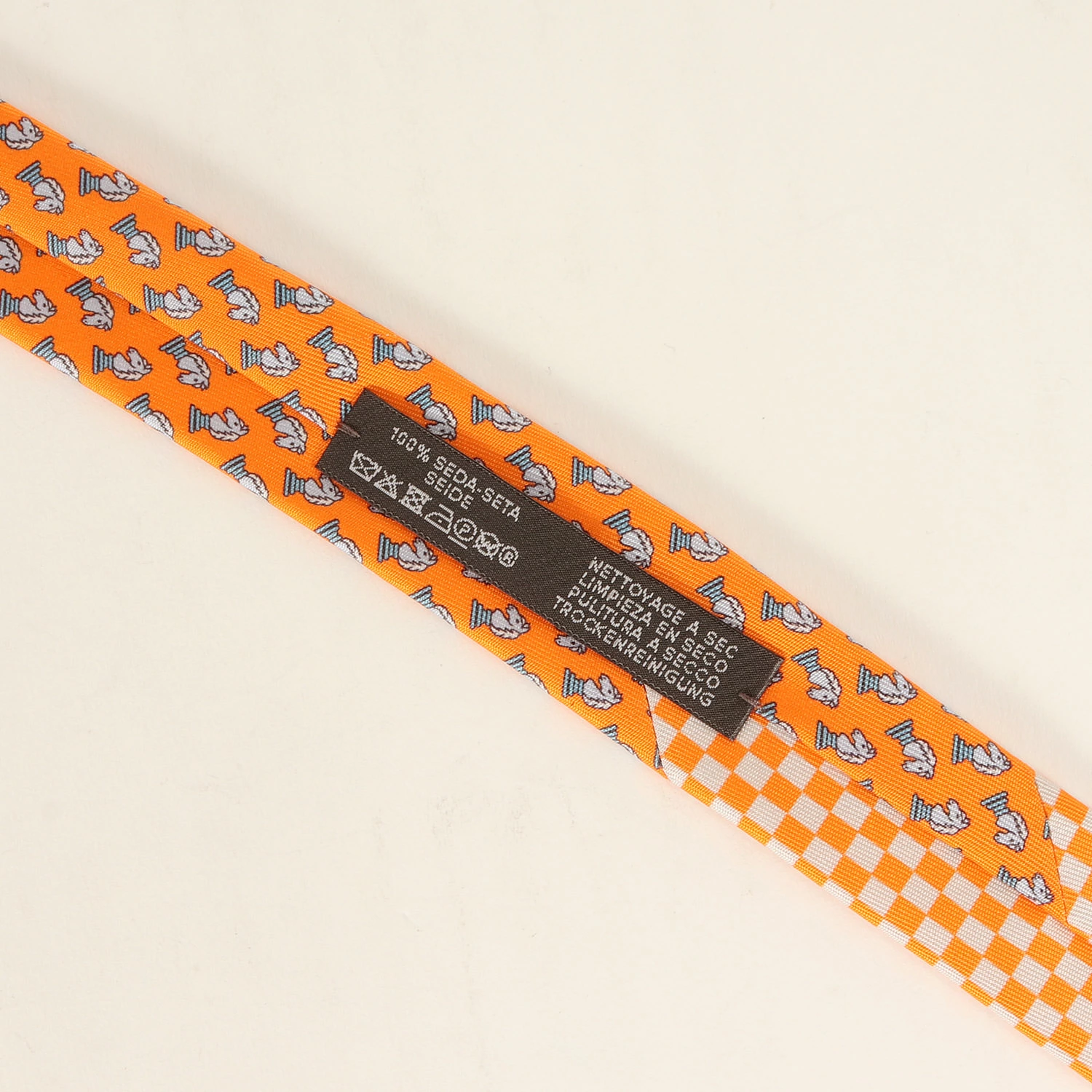 - HERMESらしい上品さと存在感のあるネクタイです。ナイトのチェス駒(馬の頭)をモノグラム、チェッカーであしらったデザインです。エンドのロゴは「ショップバッグ」を取り入れています。