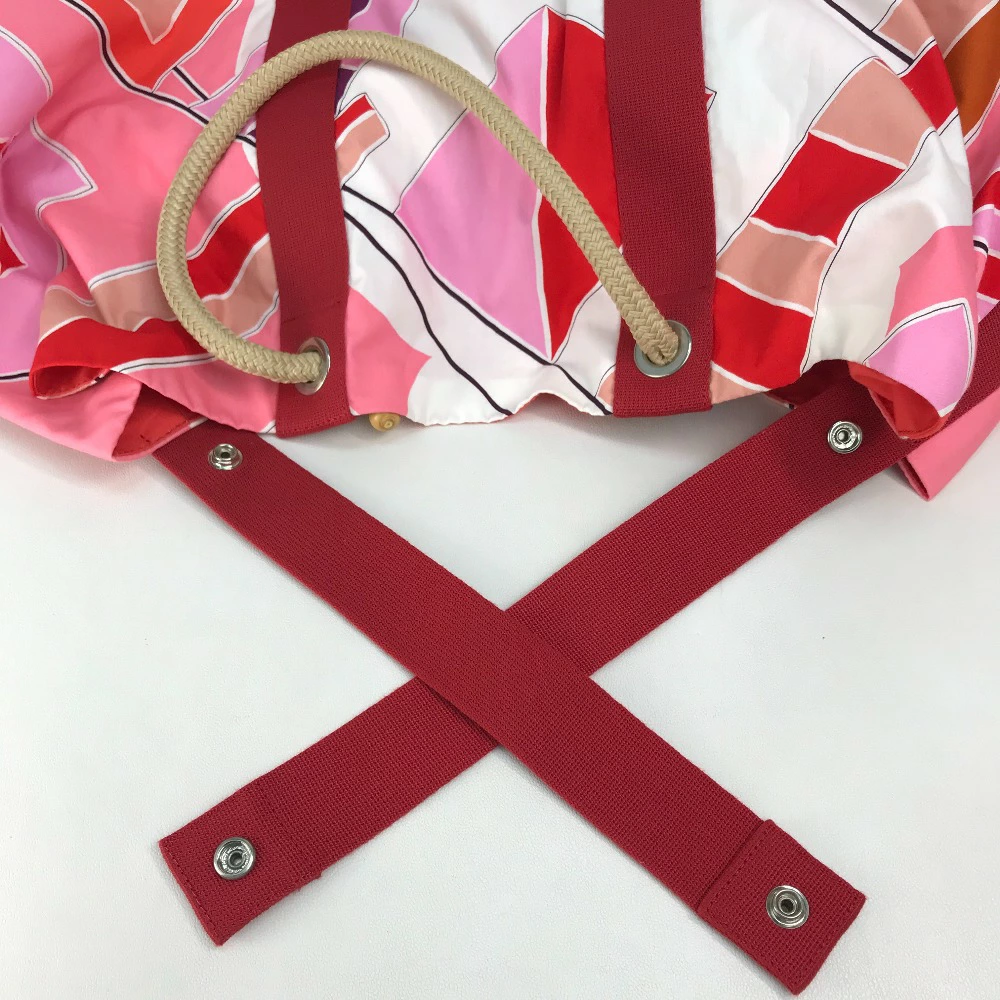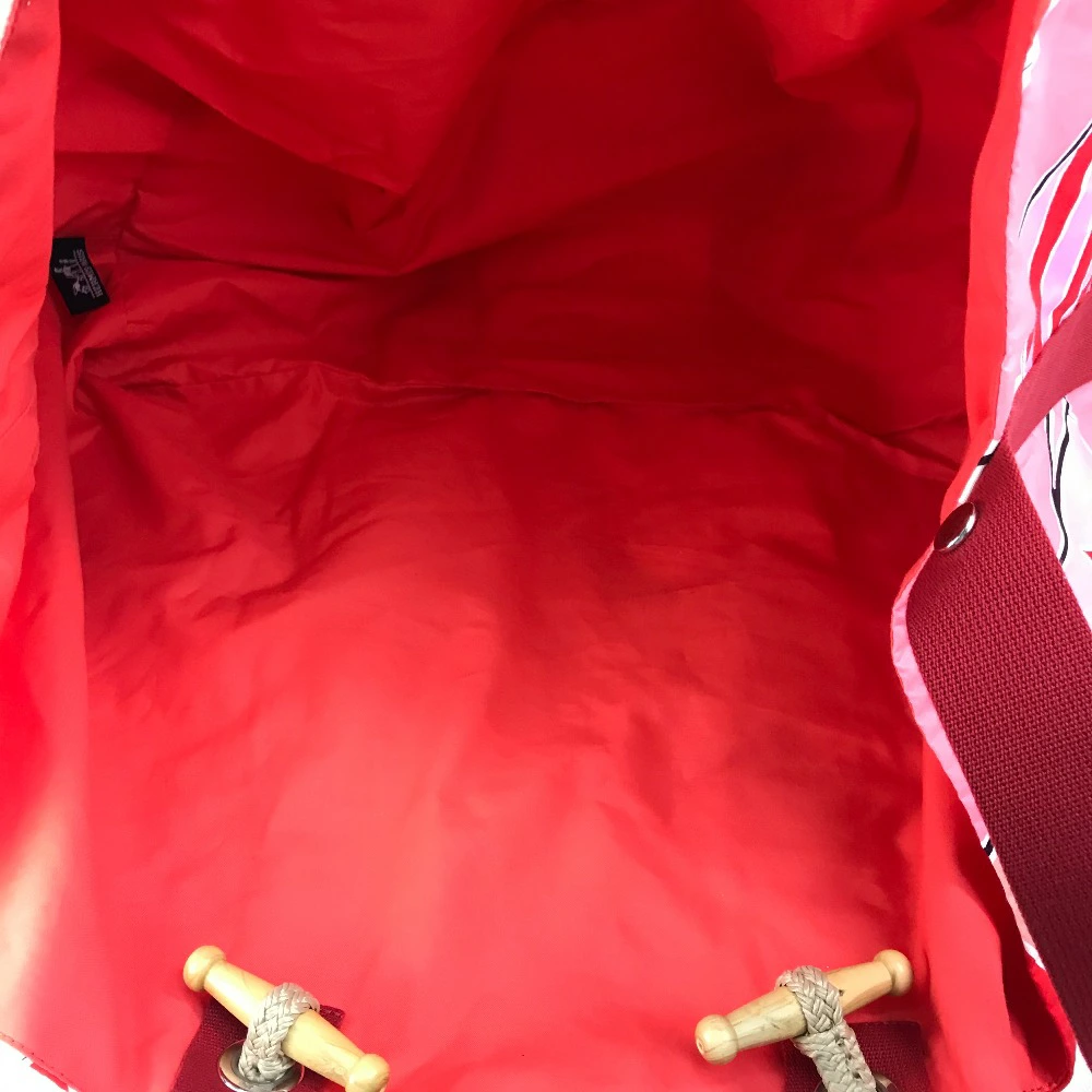 | 商品説明 | 大きめのビーチバッグです。ピンク系のキュートなカラーで仕上げたデザインが印象的です。収納力も良く、柔らかな素材なので、マザーズバッグとして使うのにもお薦めです。 |