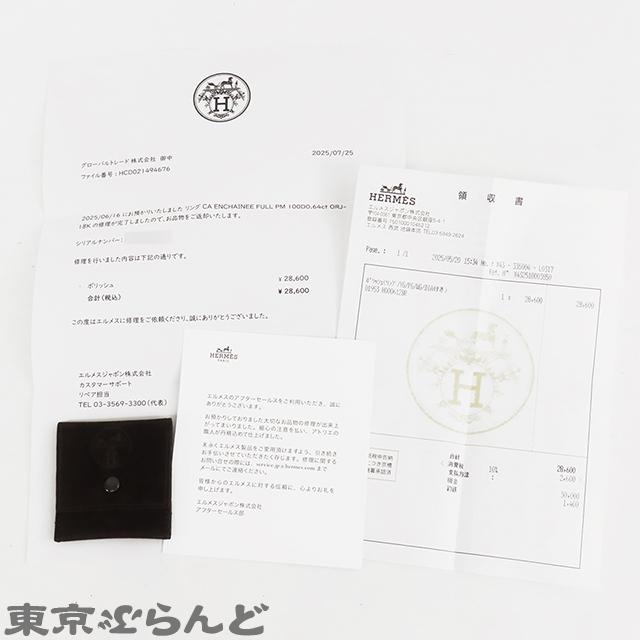 BrandHermèsProduct NameChaîne d'Ancre Enchaîne PM Ring, 100D 0.64ct Diamond, Size 12OverviewTotal Weight: 4.4gMaterial18K Yellow Gold with DiamondSizeIndicated Size: 52Equivalent to a size 12Ring Width: Approximately 6.5mmStone: DiamondStone Carat Weight: 0.64ctColor: Yellow GoldAccessories: Dust bag (damaged)ReceiptRepair Completion Certificate (July 25, 2025)CardItem Score: 9.5Additional Information: Finished at an authorized retailer on July 25, 2025.*There are some minor scratches that could not be polished away.