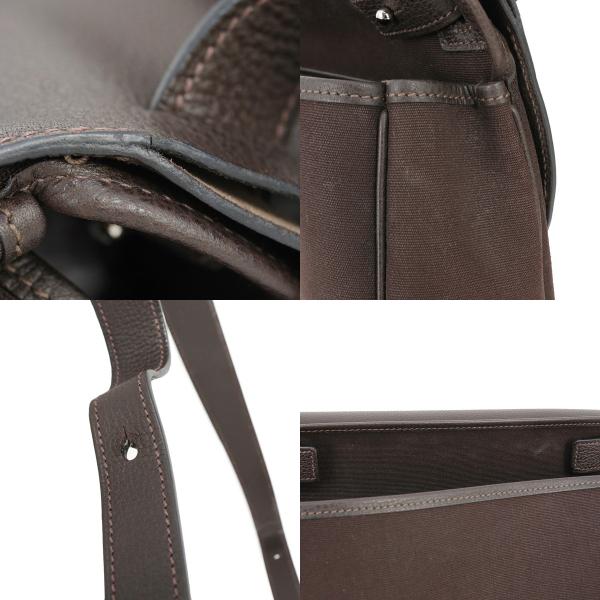 【外 側】・キャンバスに白汚れ、スレ、毛羽立ちが若干有り・コバに若干の割れ有り・レザーに若干の汚れ、スレ有り・ストラップ調節穴に若干に伸び有り