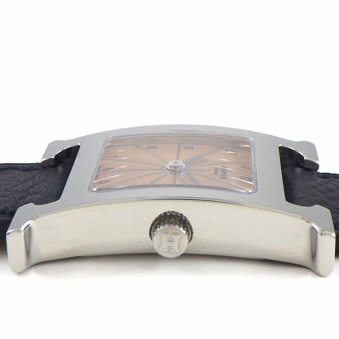Pre-owned HERMES H Watch HH1.210 Square Coral Pink Guilloché Dial Stainless Steel Black Epsom Leather Strap Quartz Analogue Watch with Box and Warranty.