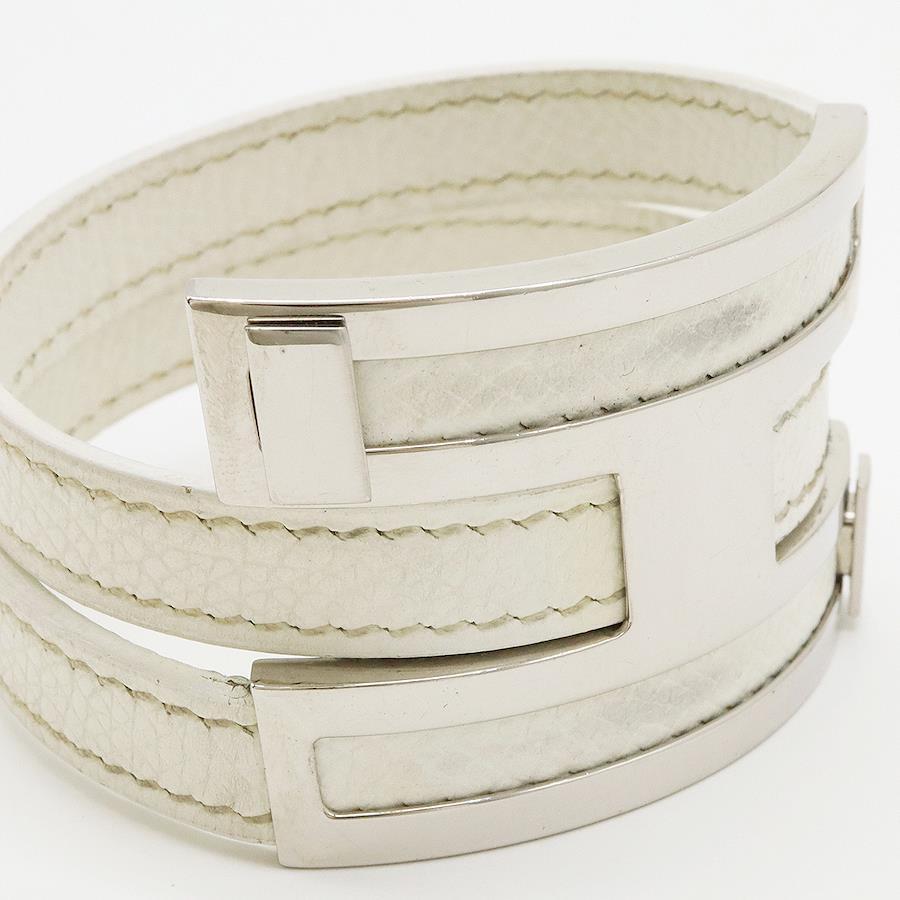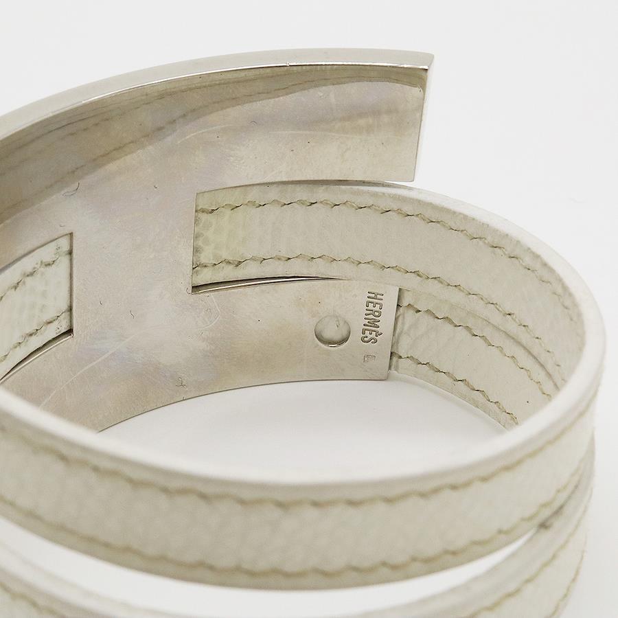 HERMES Puspus Bracelet Bangle H Motif Leather Metal White Silver Hardware □J Engraved