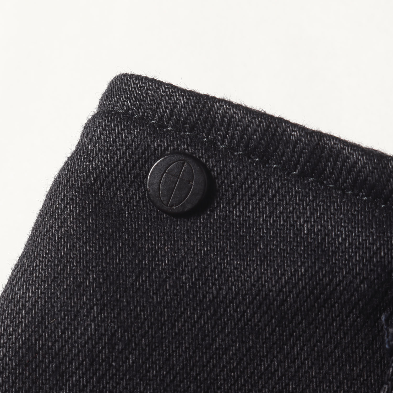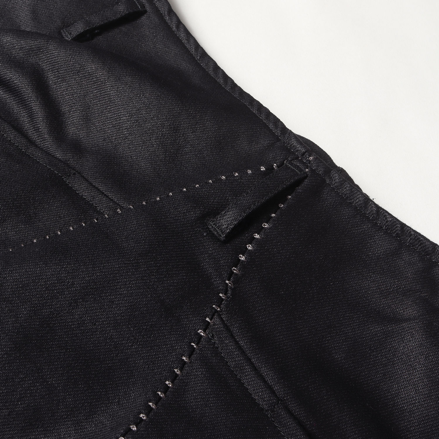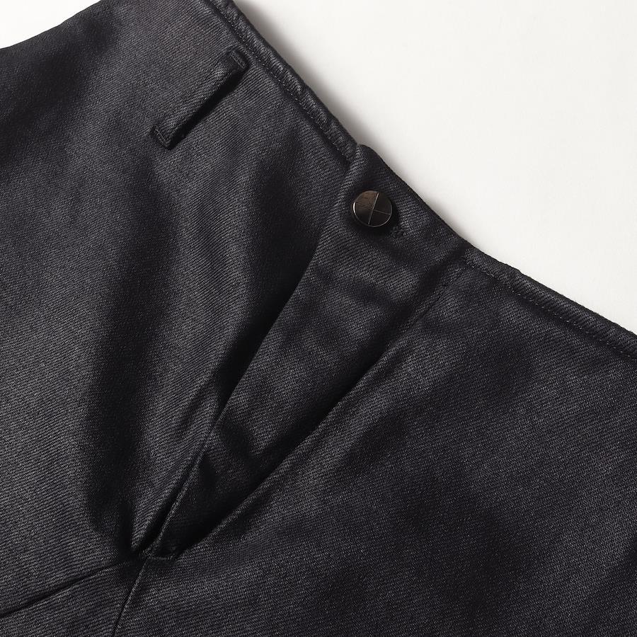 - コーティング加工が施されたストレッチデニム生地を使用し、チャコールカラーのステッチデザインがあしらわれたサルエルパンツです。