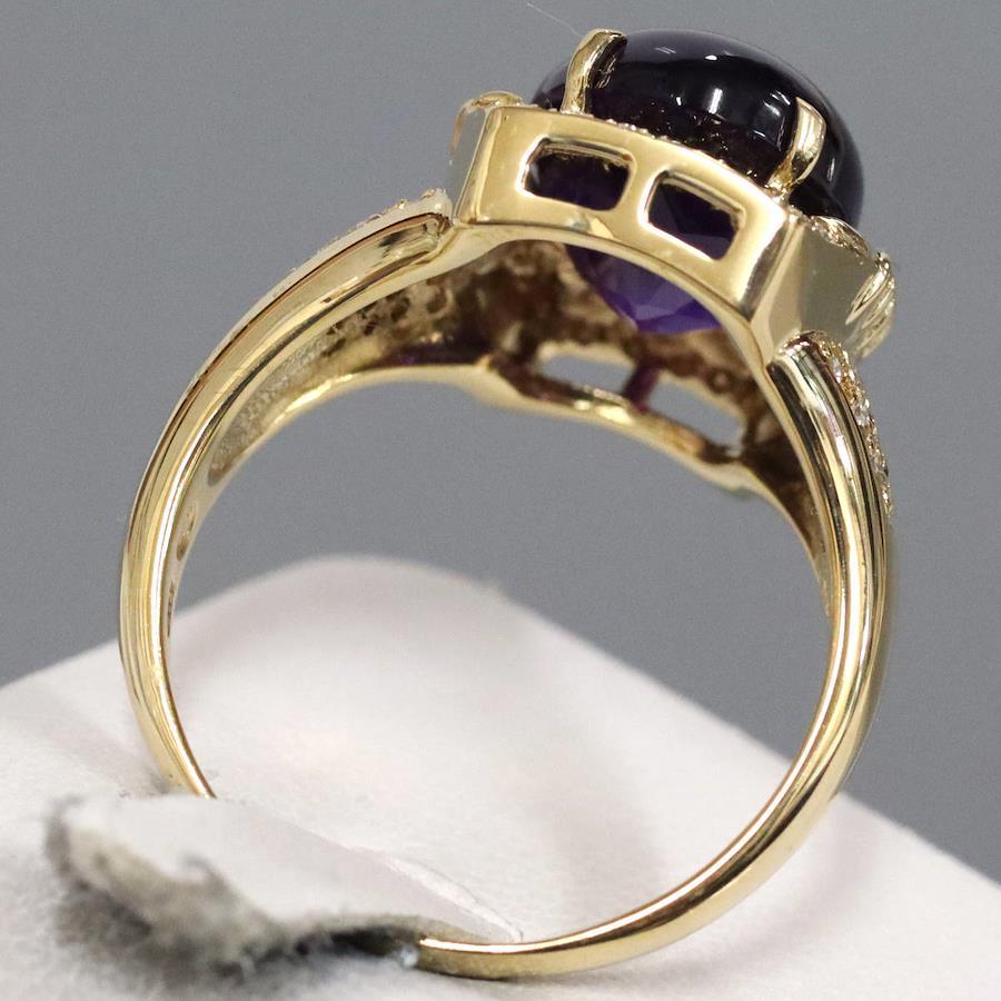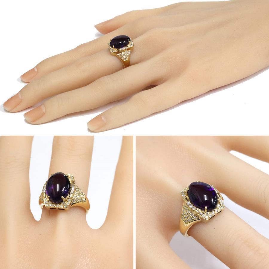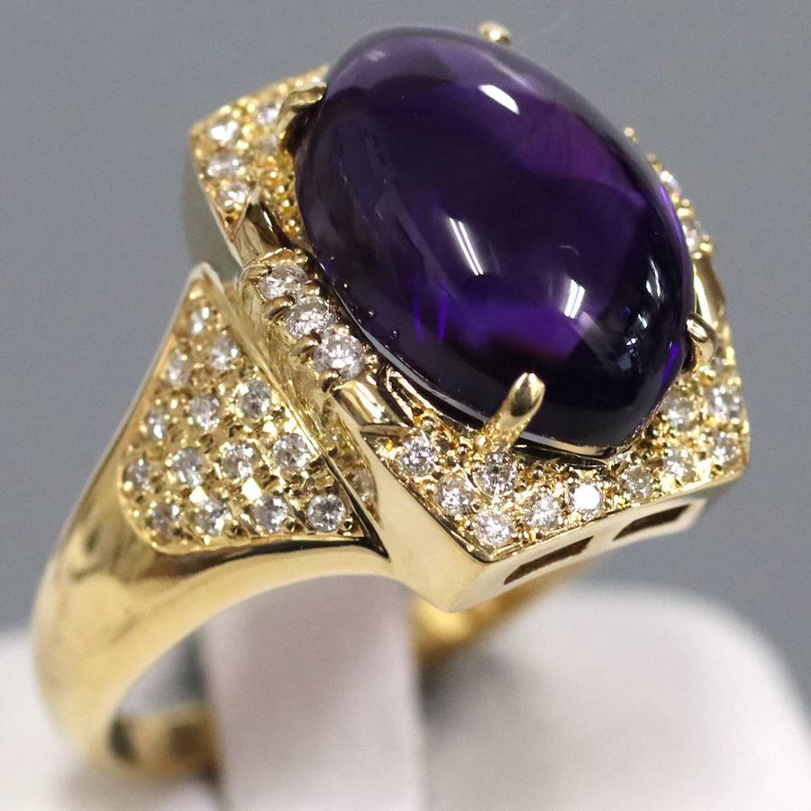 K18アメジストダイヤモンドリングの中古品です。彩度の高い濃い紫色のアメジストがセットされています。アメジストは表面にわずかに傷があり、肉眼では目立たないインクルージョンがあります。ダイヤモンドはインクルージョンが少ないです。地金にはわずかに小傷があります。+---+---+---+---+---+。{状態}A{素材}K18YG,アメジスト,ダイヤモンド{サイズ}当店計測約#17{リング幅}約2-16mm。{その他}AM6.60ct,D0.32ct,8.6g。{付属品}なし(サービス箱をお付けします){お問合せ商品番号}25103035+---+---+---+---+---+。