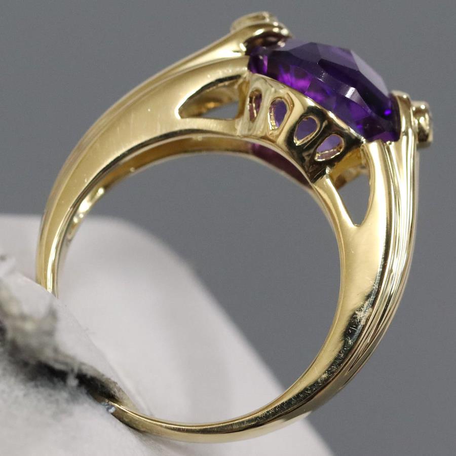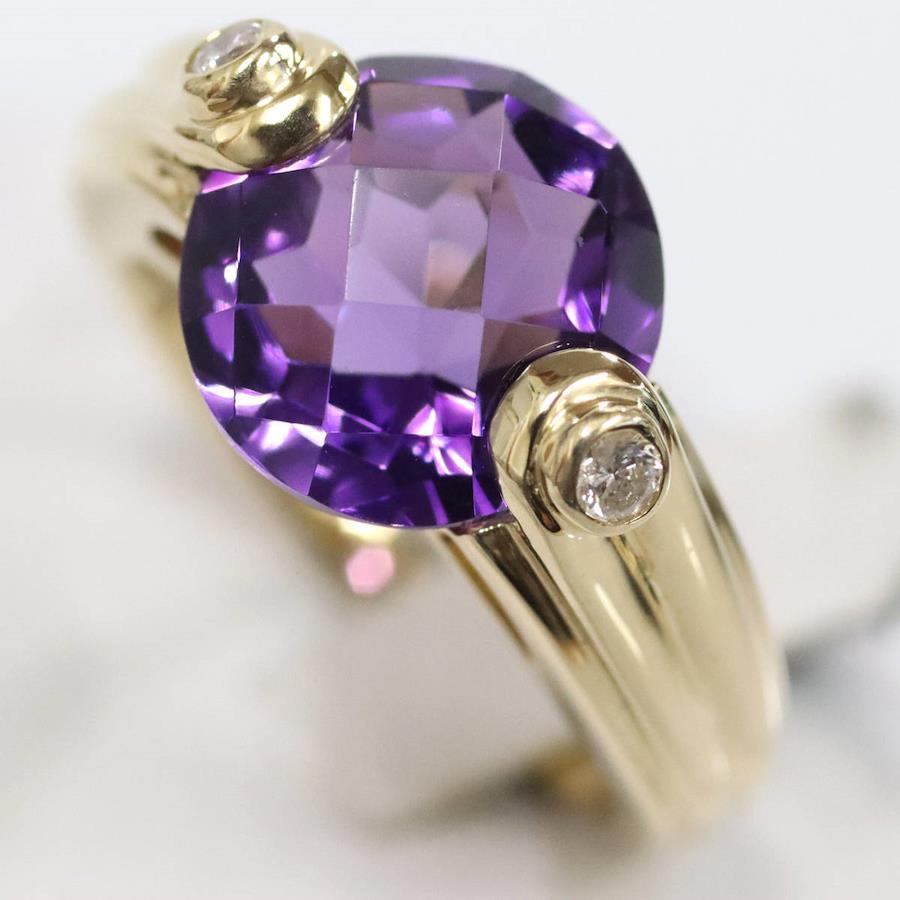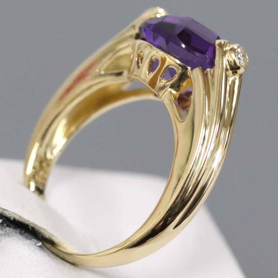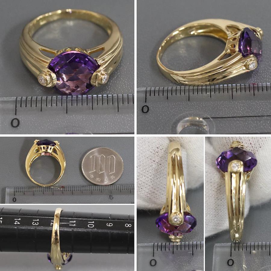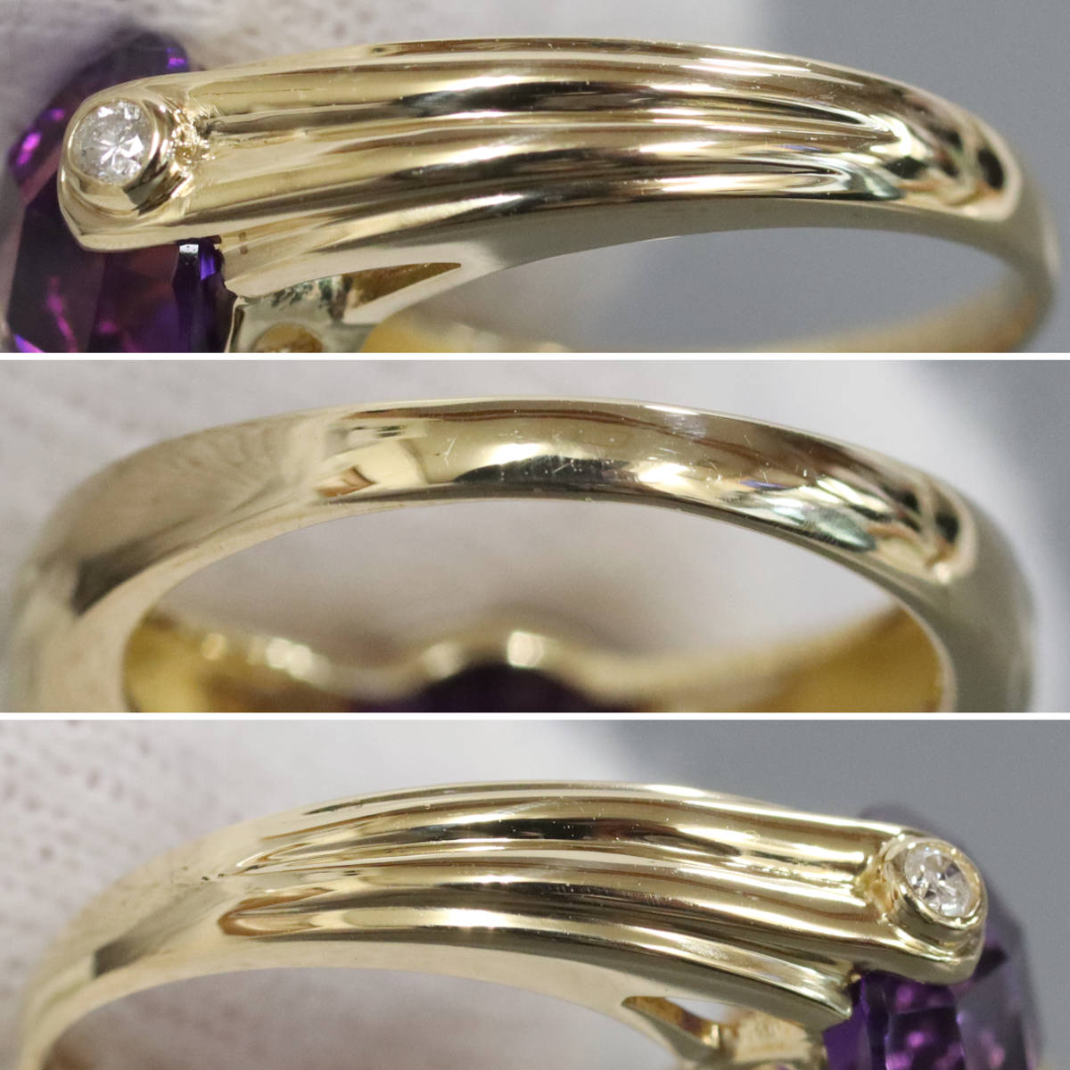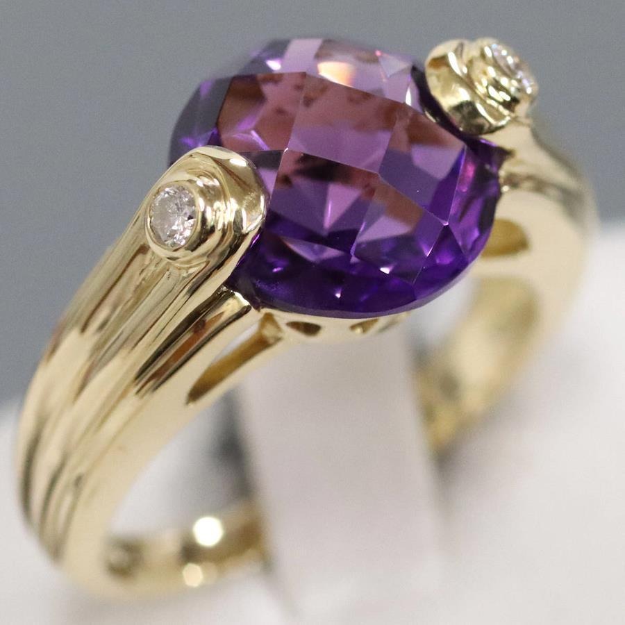 K18アメジストダイヤモンドリングの中古品です。天然アメジストと鑑別された鑑別カードが付属します。大粒のアメジストが目を引くデザインです。アメジストの石目の刻印はありません。2粒ダイヤモンドがセットされており、ややインクルージョンがありますが、肉眼では見えません。地金にはサイズ直しの跡があり、わずかに小傷があります。+---+---+---+---+---+。{状態}AB{素材}K18YG,アメジスト,ダイヤモンド{サイズ}当店計測約#12{リング幅}約2-11mm。{その他}D0.07ct,6.6g。{付属品}鑑別カード{お問合せ商品番号}25086015+---+---+---+---+---+。