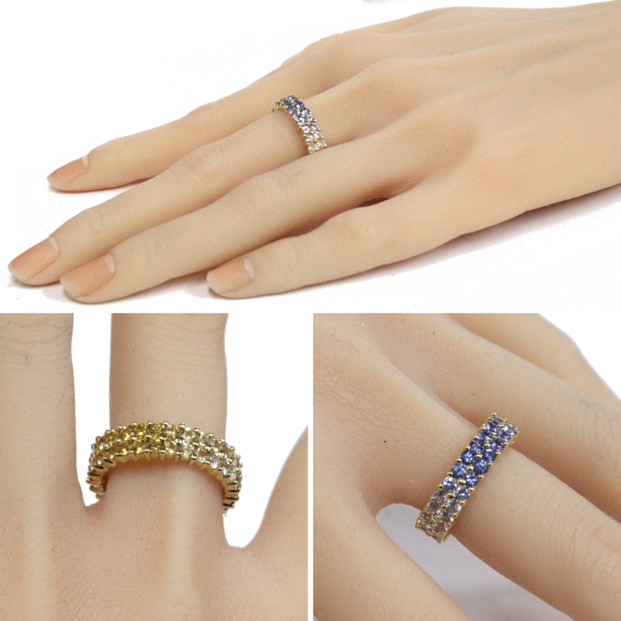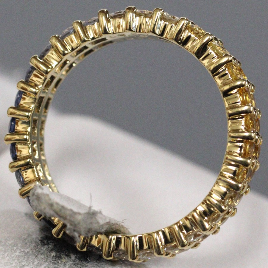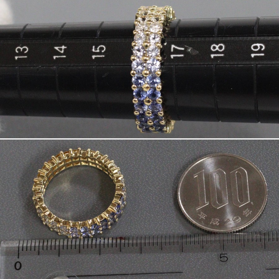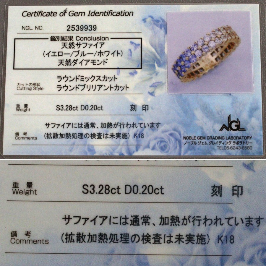 K18イエロー/ブルー/ホワイトサファイアダイヤモンドリングの中古品です。2列でセットされたフルエタニティリングです。天然のサファイア ダイヤモンドと認める鑑別カードが付属します。グラデーションになっており美しい色味です。全体的にインクルージョンが少なく、照りよく輝きます。地金にはわずかに小傷があります。+---+---+---+---+---+。{状態}A{素材}K18YG,サファイア,ダイヤモンド{サイズ}当店計測約#16.5{リング幅}約5mm。{その他}S3.28ct,D0.20ct,6.7g。{付属品}鑑別カード{お問合せ商品番号}26036025+---+---+---+---+---+。