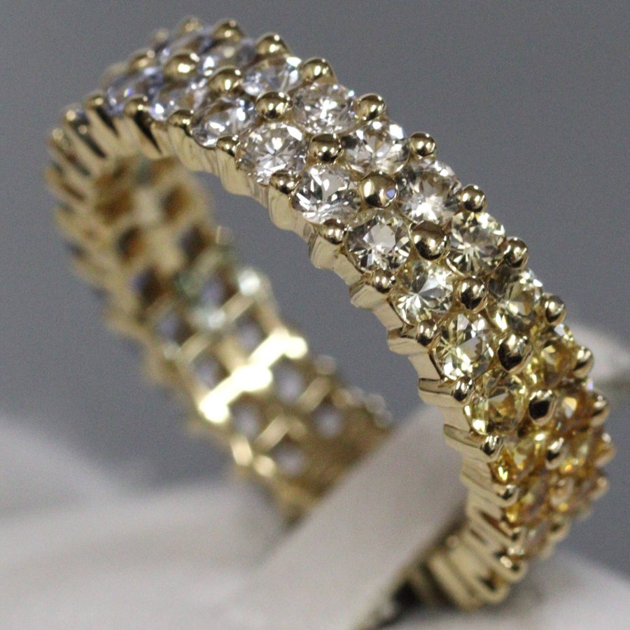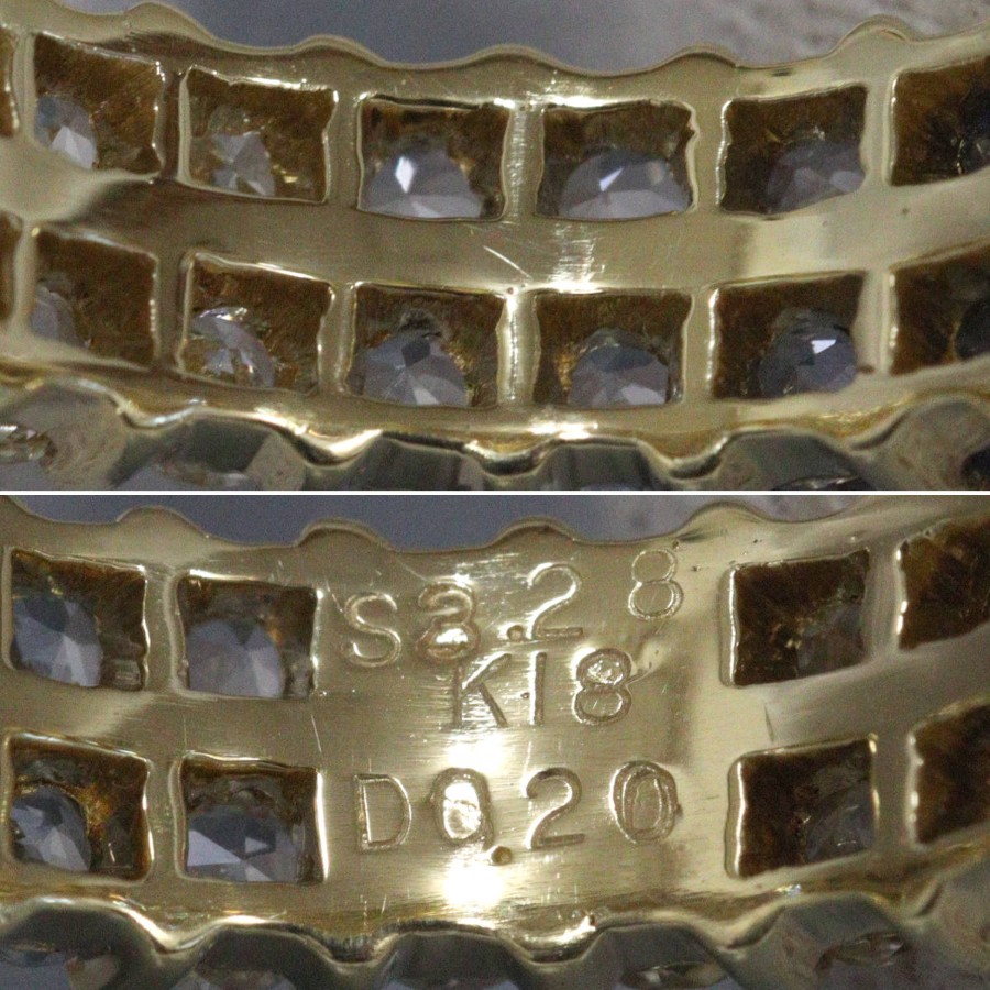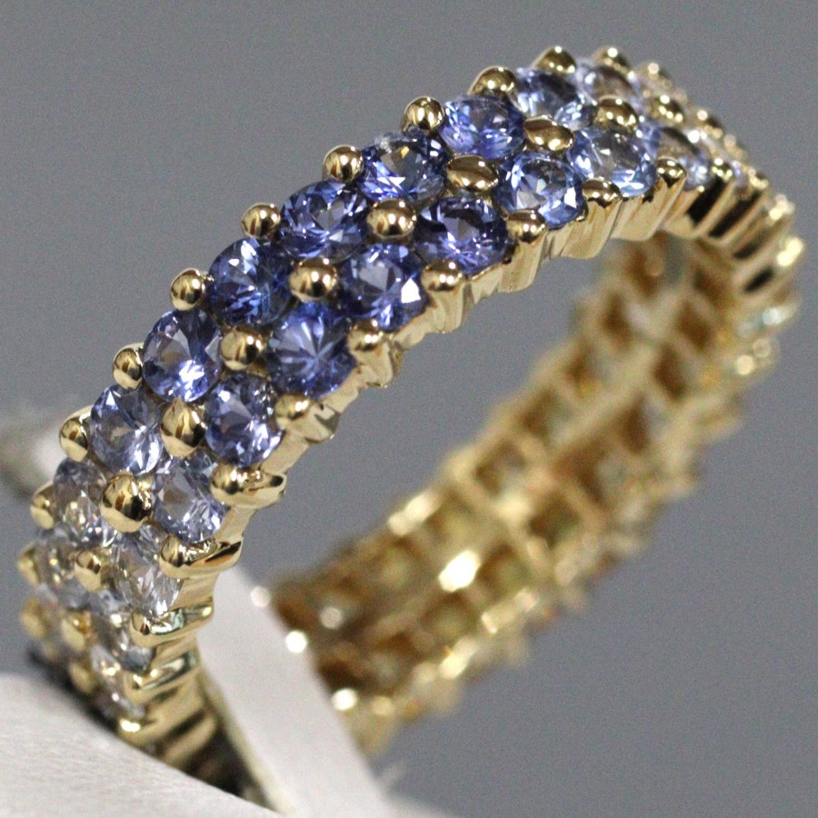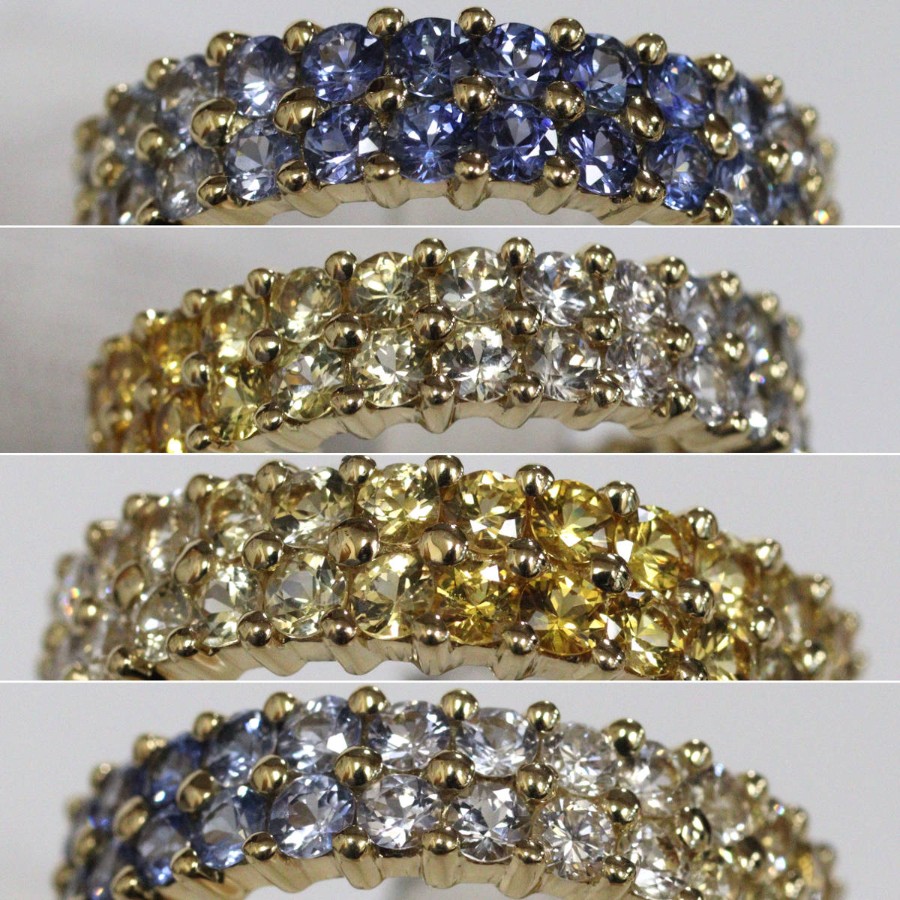 K18イエロー/ブルー/ホワイトサファイアダイヤモンドリングの中古品です。2列でセットされたフルエタニティリングです。天然のサファイア ダイヤモンドと認める鑑別カードが付属します。グラデーションになっており美しい色味です。全体的にインクルージョンが少なく、照りよく輝きます。地金にはわずかに小傷があります。+---+---+---+---+---+。{状態}A{素材}K18YG,サファイア,ダイヤモンド{サイズ}当店計測約#16.5{リング幅}約5mm。{その他}S3.28ct,D0.20ct,6.7g。{付属品}鑑別カード{お問合せ商品番号}26036025+---+---+---+---+---+。