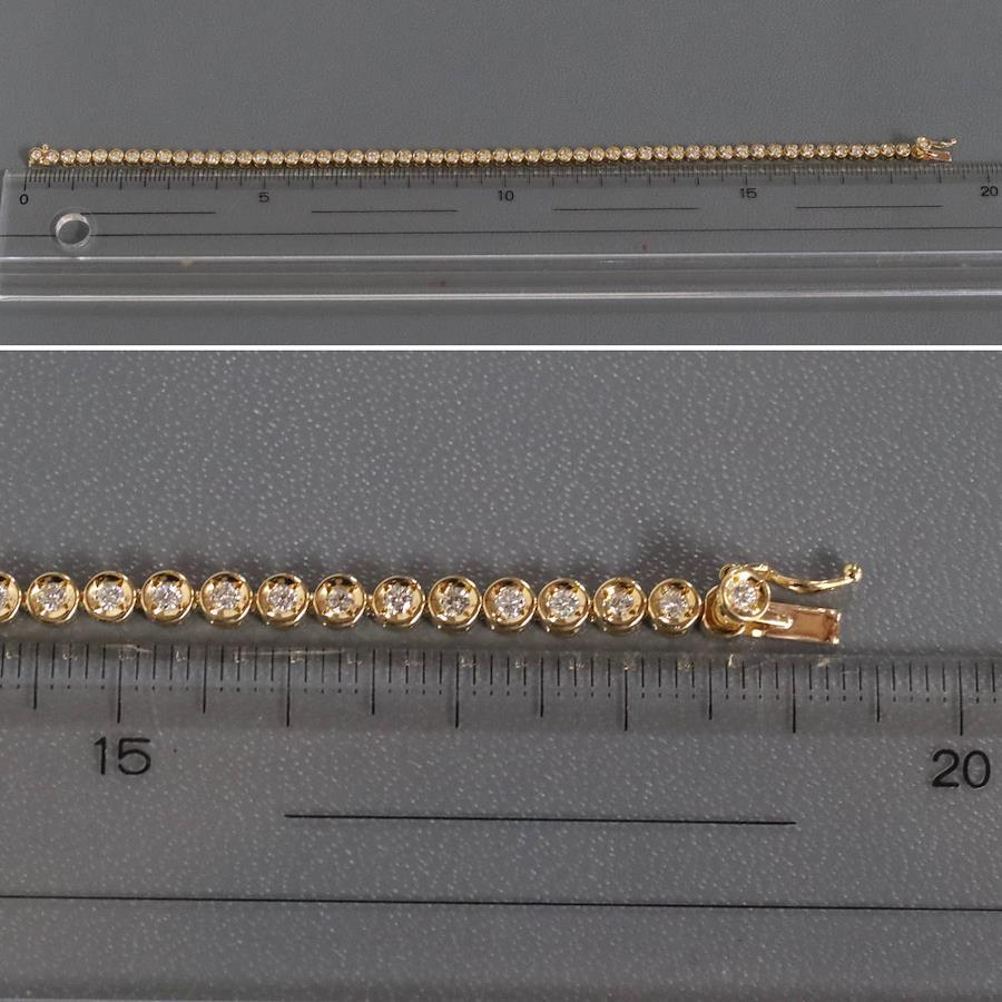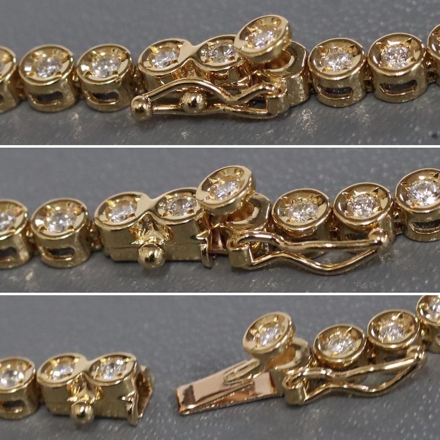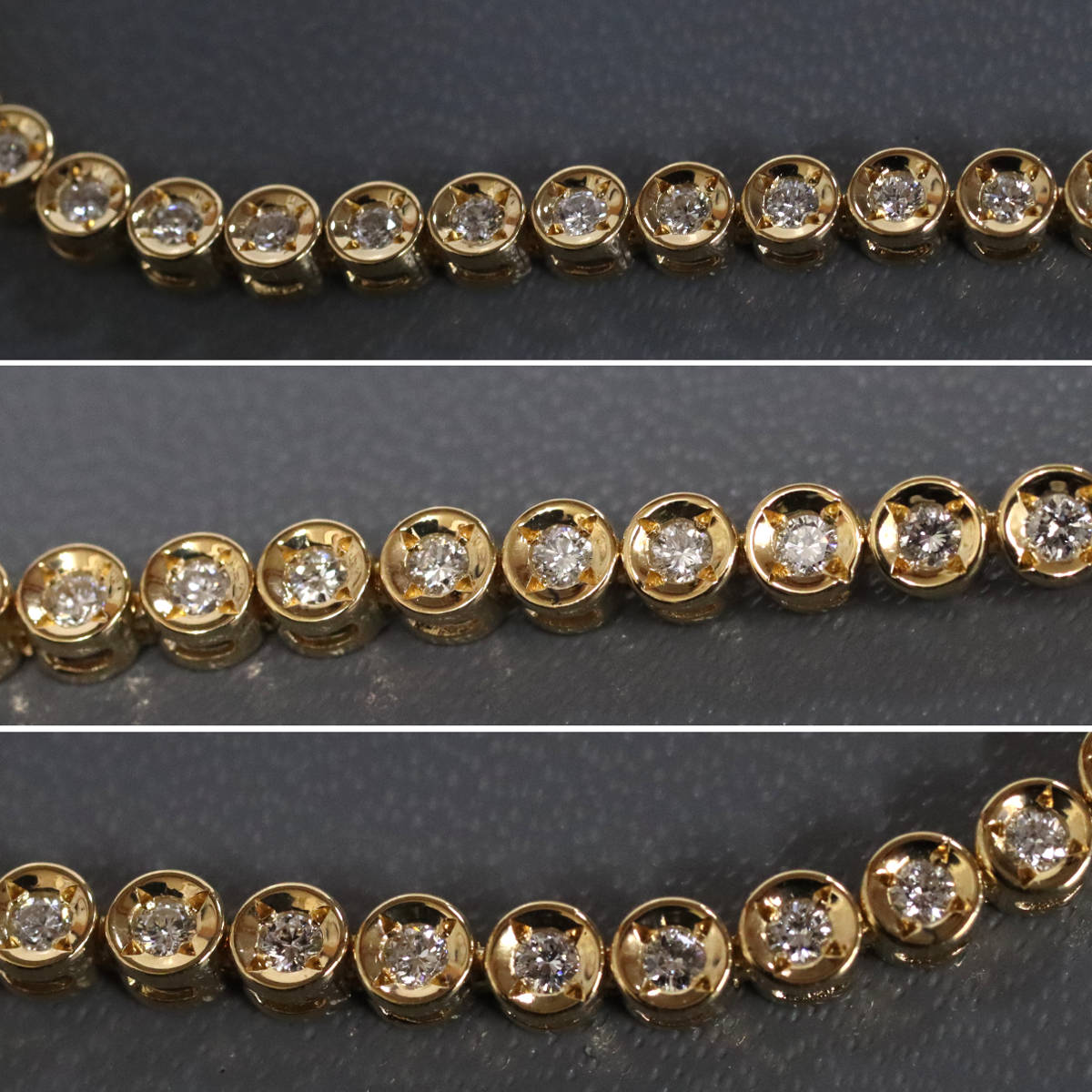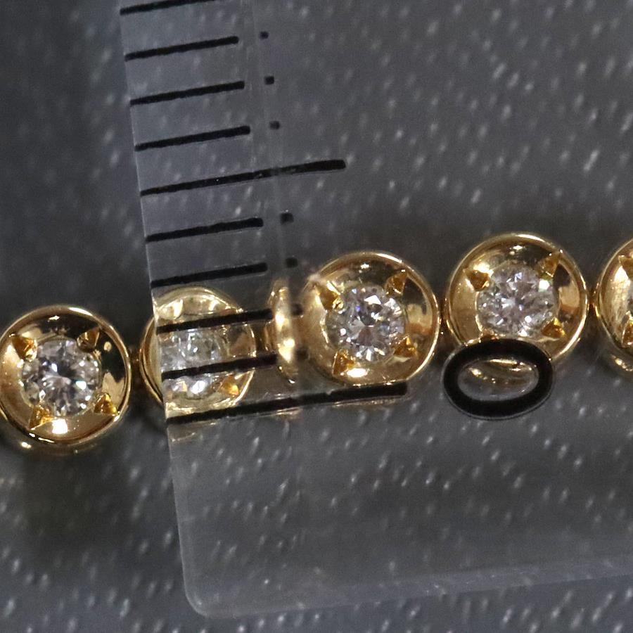 K18ダイヤモンドテニスブレスレットの中古品です。ダイヤモンドは全体的に肉眼では見えないインクルージョンがわずかにあります。ダイヤモンドは無色に近い色味で、照りよく輝きます。腕回りは約18.5cmです。地金には小傷があります。+---+---+---+---+---+。{状態}AB{素材}K18YG,ダイヤモンド{サイズ}約18.5cm。幅約3mm。{その他}D1.00ct,8.4g。{付属品}なし(サービス箱をお付けします){お問合せ商品番号}25106031+---+---+---+---+---+。