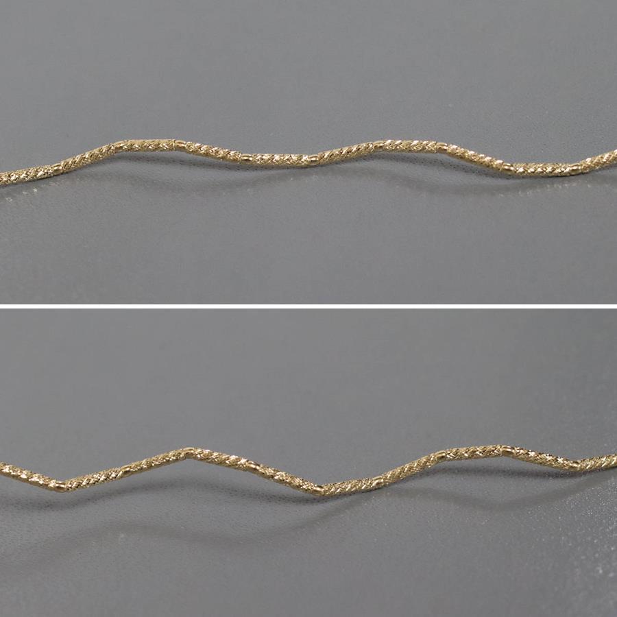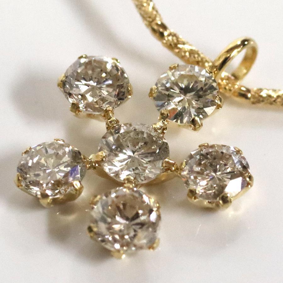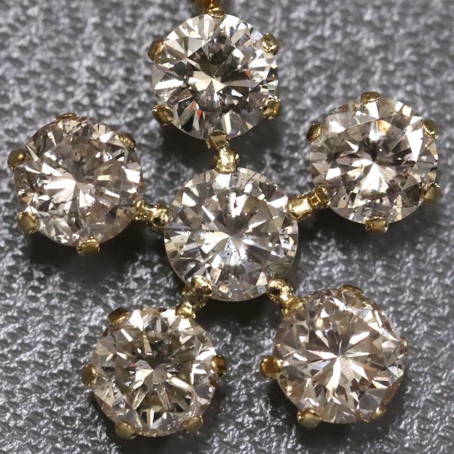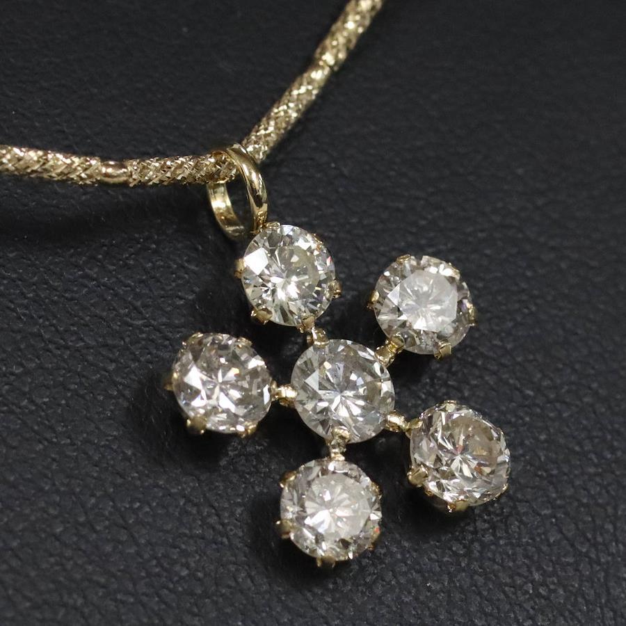 K18ダイヤモンドペンダントの中古品です。6粒で総計2.31カラットのダイヤモンドがセットされています。チェーンは3.2g、トップは1.0gです。チェーンはワイヤーのようにグネグネとした形になっています。ダイヤモンドは全体的にカーボン状のインクルージョンが多く、目を凝らせば肉眼で見えるものもあります。ダイヤモンドは照りよく輝きます。地金にはわずかに小傷があります。+---+---+---+---+---+。{状態}AB{素材}トップK18YG,ダイヤモンドチェーンK18YG{サイズ}トップ約W15mm × H20mm(バチカン含む)チェーン長約36-40cm(アジャスター付き){その他}D2.31ct,4.2g。{付属品}なし(サービス箱をお付けします){お問合せ商品番号}25096037+---+---+---+---+---+。