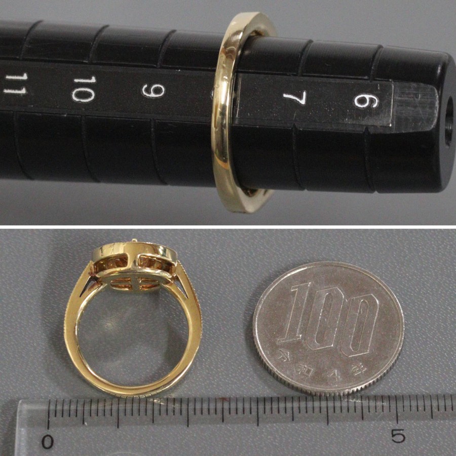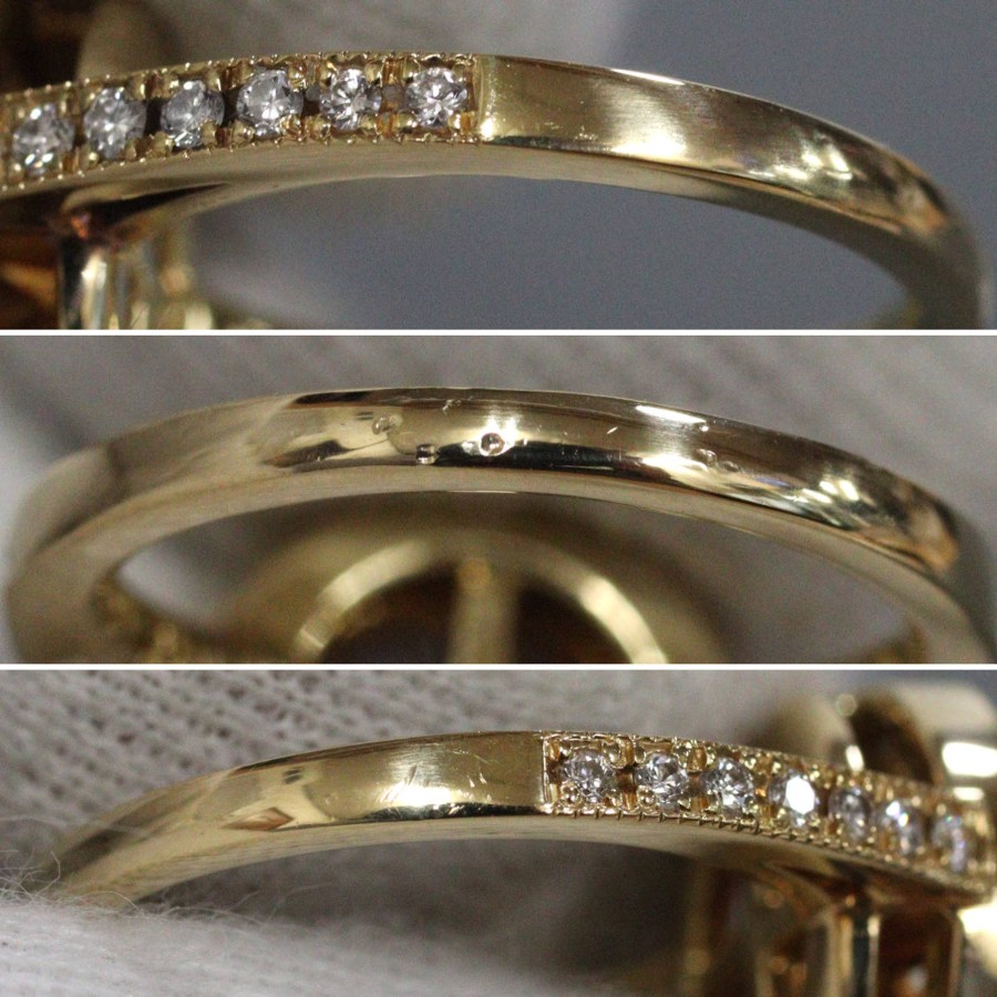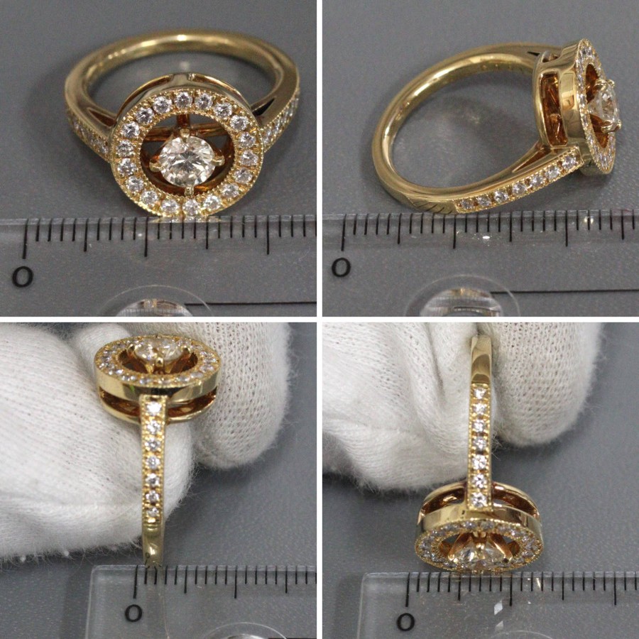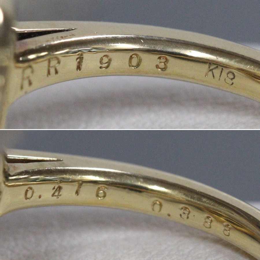 K18ダイヤモンドリングの中古品です。中石はわずかに黄色がかった色味で、ややインクルージョンがありますが、照りよく輝きます。メレダイヤモンドは無色に近い色味で、インクルージョンが少なく照りよく輝きます。リング底部に打ち痕があり、地金に小傷があります。+---+---+---+---+---+。{状態}AB{素材}K18YG,ダイヤモンド{サイズ}当店計測約#8{リング幅}約2-13mm。{その他}D0.416ct,D0.388ct,6.3g。{付属品}なし(サービス箱をお付けします){お問合せ商品番号}26036062+---+---+---+---+---+。