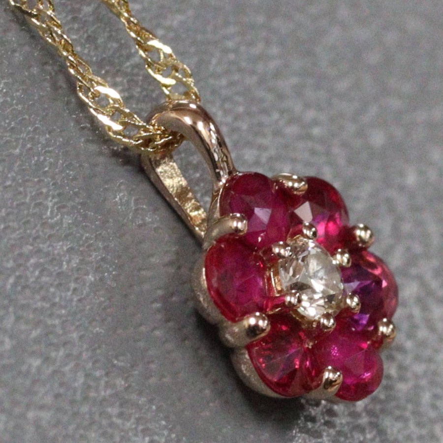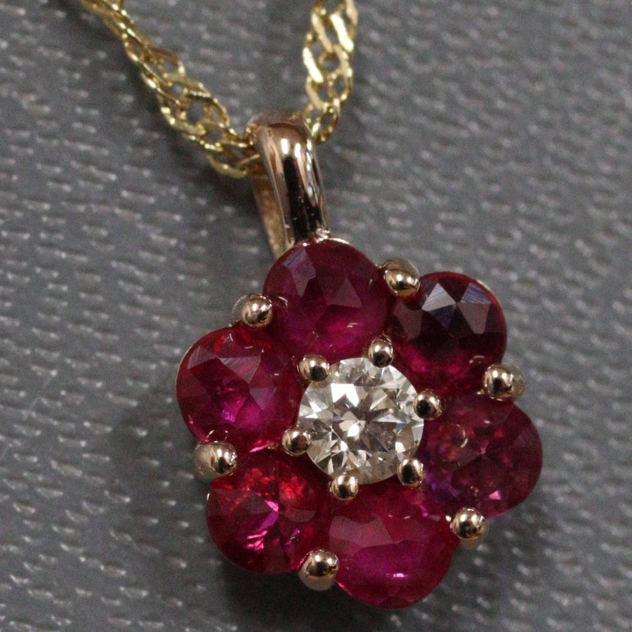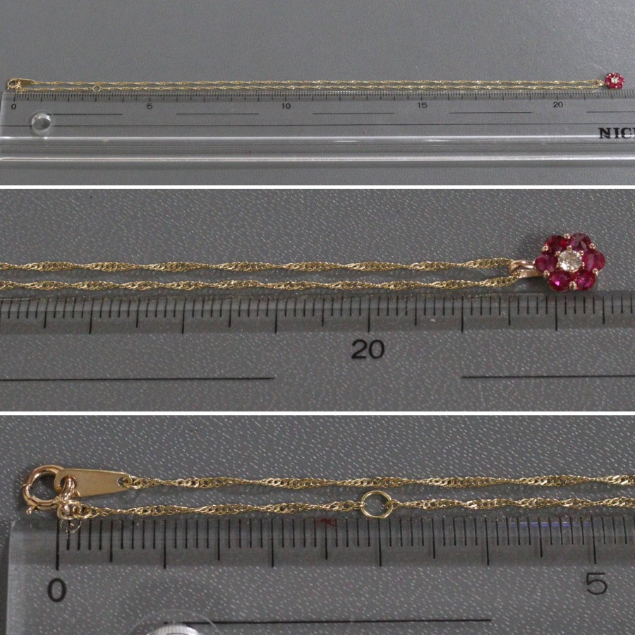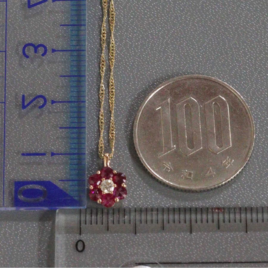 K18ルビーダイヤモンドペンダントの中古品です。ルビーはローズカットで、バチカン側の3石はテーブルが上、下の3石はテーブルが下(キューレットが上)向きにセットされています。ルビーは彩度が高くやや紫がかった赤色です。ダイヤモンドは無色に近い色味で、ややインクルージョンがありますが、照りよく輝きます。トップの部分のみピンクゴールドが使用されています。地金には小傷があります。+---+---+---+---+---+。{状態}A{素材}トップK18YG,ルビー,ダイヤモンドチェーン{サイズ}トップ約W7mm × H10mm(バチカン含む)チェーン長約43cm。{その他}R0.35ct,D0.05ct,1.9g。{付属品}なし(サービス箱をお付けします){お問合せ商品番号}26036059+---+---+---+---+---+。
