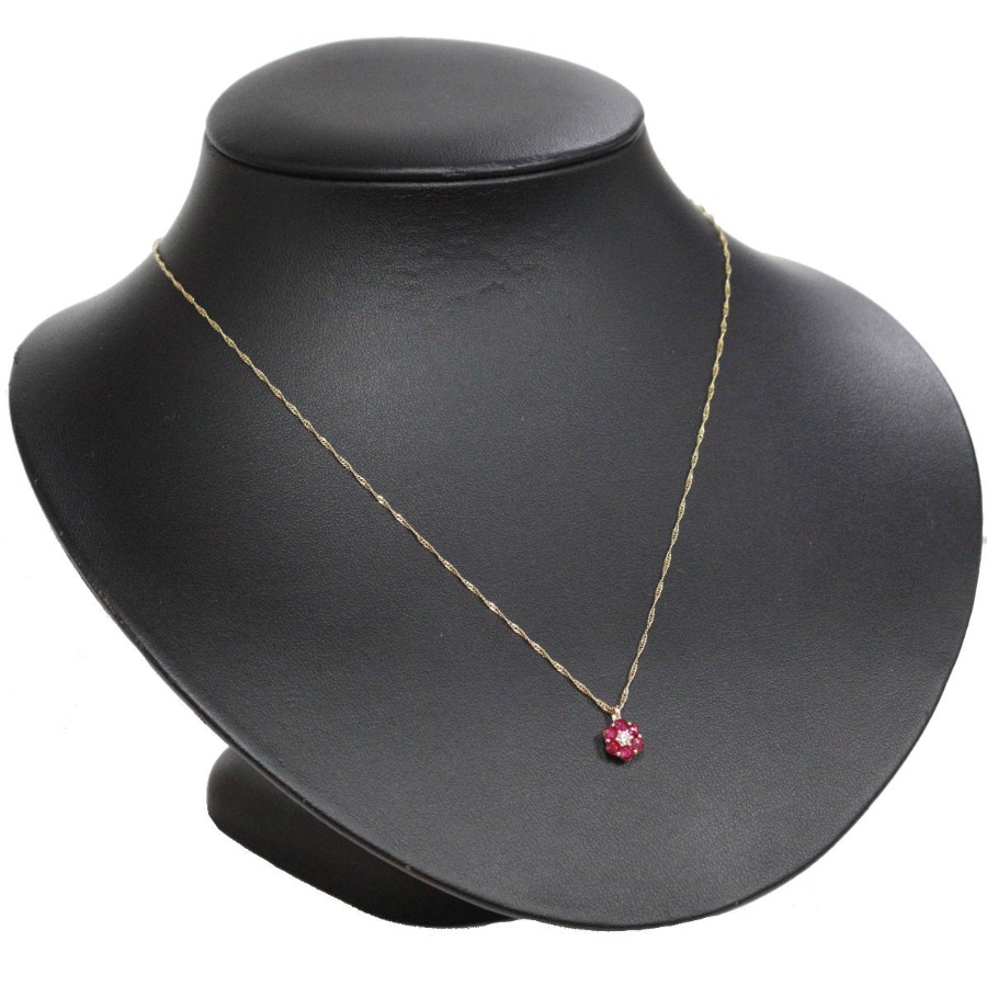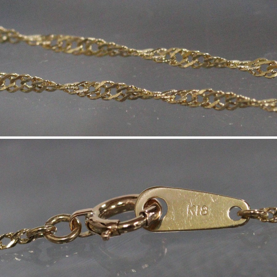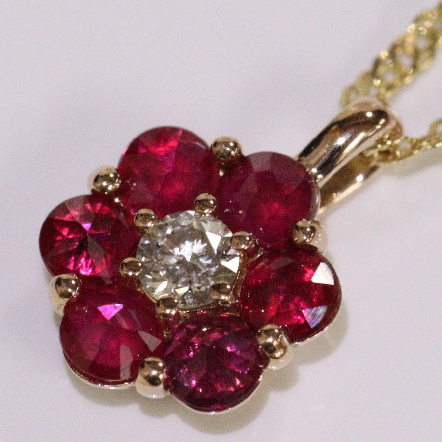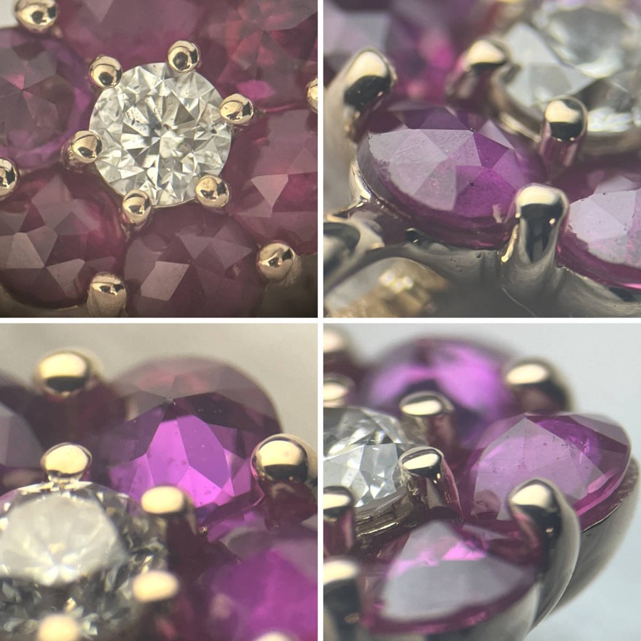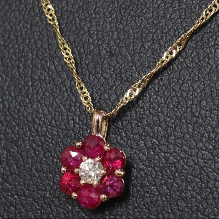 K18ルビーダイヤモンドペンダントの中古品です。ルビーはローズカットで、バチカン側の3石はテーブルが上、下の3石はテーブルが下(キューレットが上)向きにセットされています。ルビーは彩度が高くやや紫がかった赤色です。ダイヤモンドは無色に近い色味で、ややインクルージョンがありますが、照りよく輝きます。トップの部分のみピンクゴールドが使用されています。地金には小傷があります。+---+---+---+---+---+。{状態}A{素材}トップK18YG,ルビー,ダイヤモンドチェーン{サイズ}トップ約W7mm × H10mm(バチカン含む)チェーン長約43cm。{その他}R0.35ct,D0.05ct,1.9g。{付属品}なし(サービス箱をお付けします){お問合せ商品番号}26036059+---+---+---+---+---+。