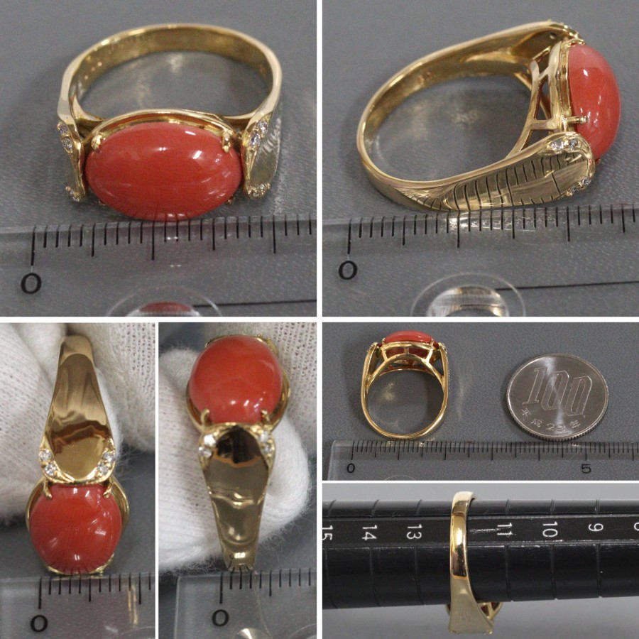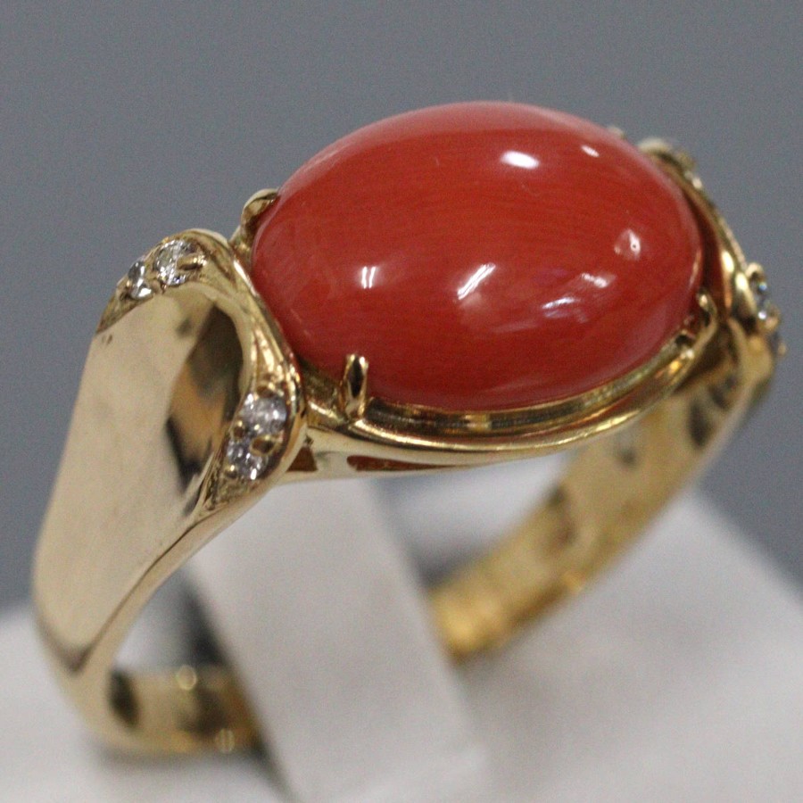 K18赤サンゴダイヤモンドリングの中古品です。天然さんごと認める鑑別書が付属します。サンゴはややオレンジがかった赤色で、表面にわずかに傷があります。地金には小傷があります。+---+---+---+---+---+。{状態}A{素材}K18YG,サンゴ,ダイヤモンド{サイズ}当店計測約#12{リング幅}約2-10mm。{その他}D0.06ct,6.0g。{付属品}鑑別書{お問合せ商品番号}26033154+---+---+---+---+---+。