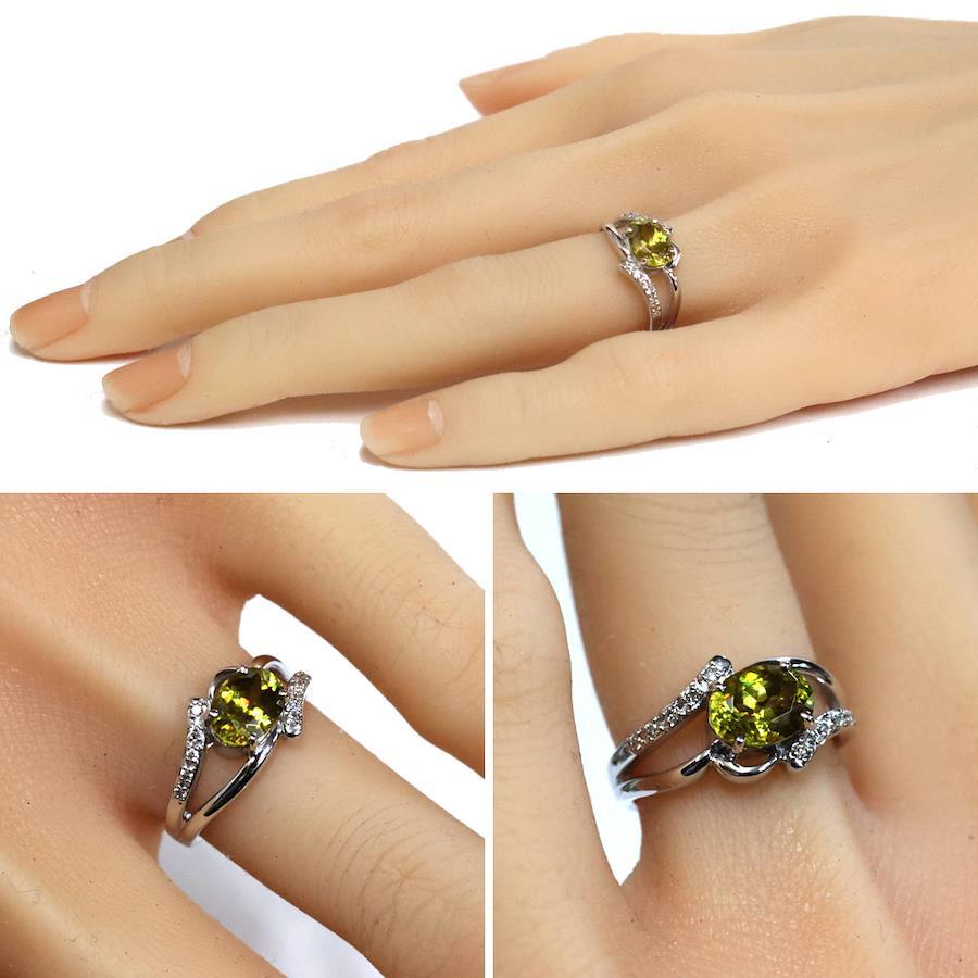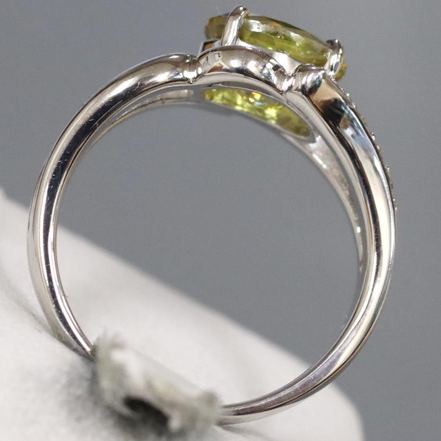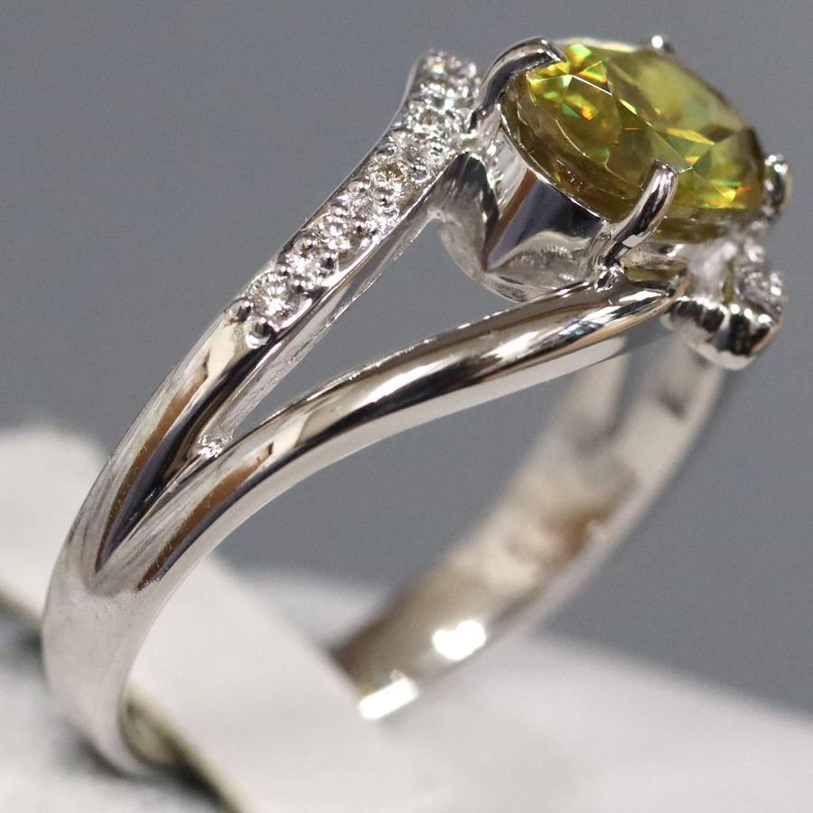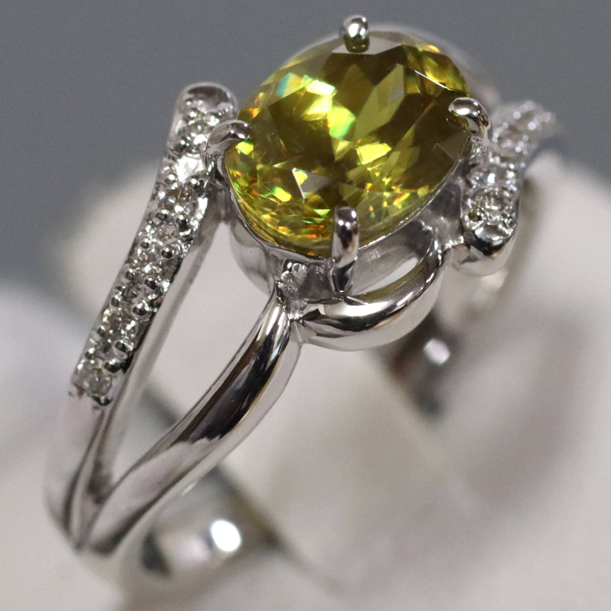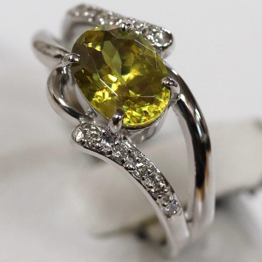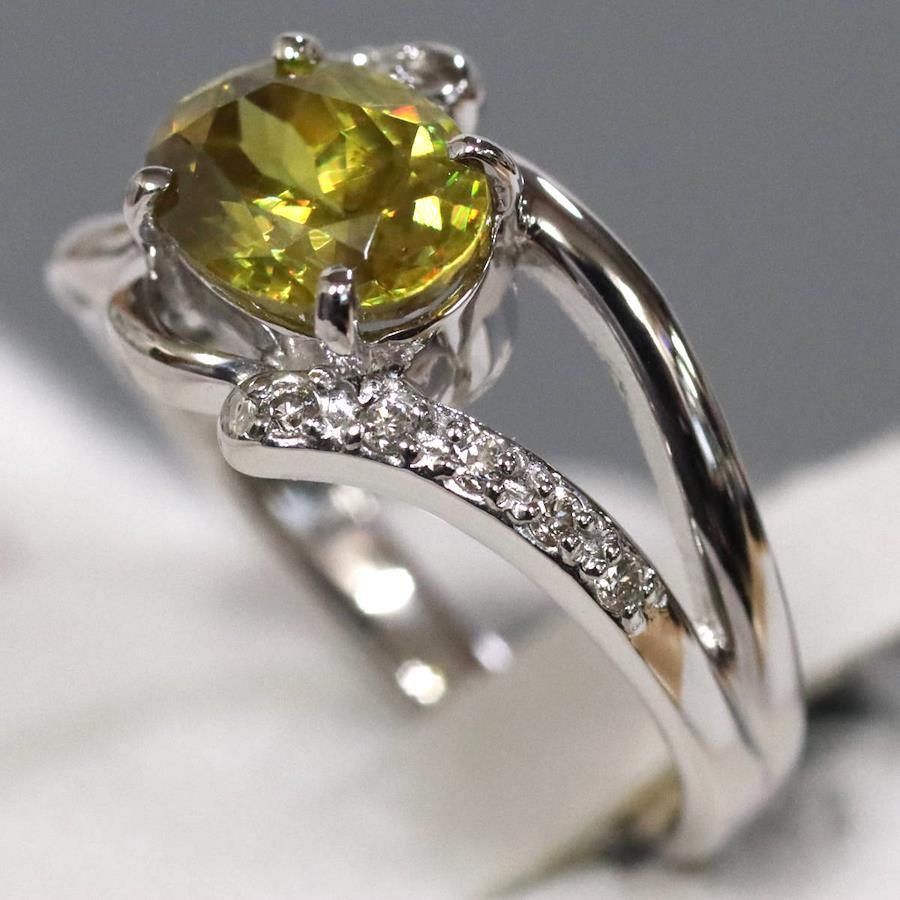 K18WGスフェーンダイヤモンドリングの中古品です。スフェーンは黄色味の強い黄緑色で、わずかにインクルージョンがあります。ファイアが見られ、キラキラと輝きを放っています。ダイヤモンドは無色に近い色味で、わずかにインクルージョンがありますが、肉眼ではわかりません。地金にはわずかに小傷があります。+---+---+---+---+---+。{状態}A{素材}K18WG,スフェーン,ダイヤモンド{サイズ}当店計測約#12{リング幅}約2-10mm。{その他}スフェーン1.67ct,D0.08ct,4.9g。{付属品}なし(サービス箱をお付けします){お問合せ商品番号}25096059+---+---+---+---+---+。