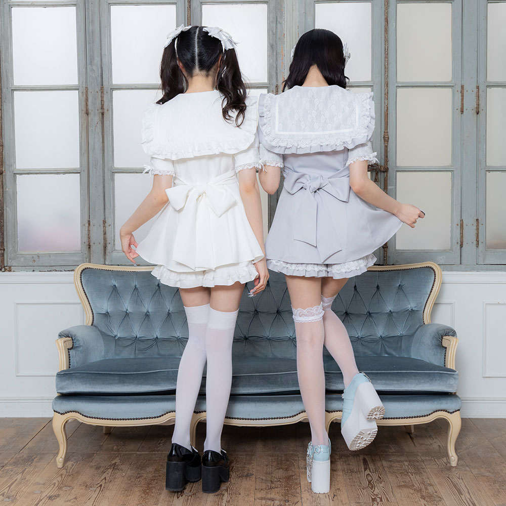 セーラーセットアップしか勝たん!かわいすぎるセーラーデザインが新しく登場♪【デザイン】かわいすぎる人気セーラーデザインセットアップが新しくなって登場♪セーラー襟とカフスにはレースが重なり、フリルたっぷりのかわいいセットアップです。胸当てとカフス部分にはレースアップリボン、胸元にはハートのキラキラバックルが輝くリボン付き。胸元リボンは安全ピンで取り外し可能です。3つついているのでリボンはいつでもかわいく安定します。パンツにもフリルとレースフリルをあしらわれたデザインに…♪一着でかわいいコーデが完成しちゃうDearMyLoveでしかないセットアップです。【素材】しっかりとしたデザインです。裏地付きになっております。ホワイトは同色のインナーを着用をオススメします。【コーディネート】量産型や地雷系コーデにオススメのアイテムです。一着でかわいくなれる魔法のセットアップ♪ニーハイに厚底ローファーがオススメです。これからの季節にも活躍するアイテムです。《透け感》カラーによってあり 《生地の厚さ》普通 《裏地》あり 《伸縮性》なし《生産国》中国