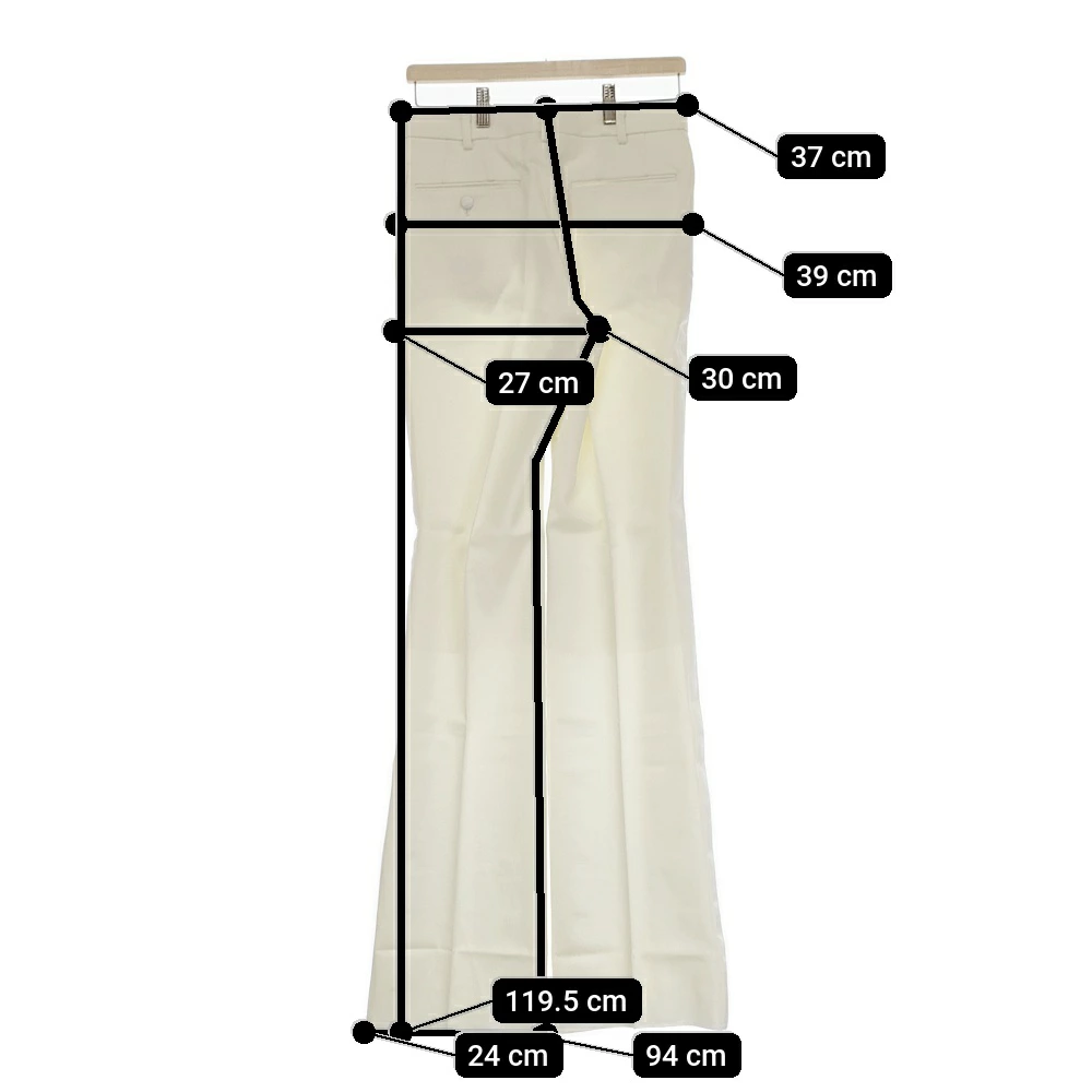 実寸サイズ | 総丈:約119.5cm ウエスト:約37cm 股上:約30cm 股下:約94cm ヒップ:約39cm ワタリ幅:約27cm 裾幅:約24cm ※記載以外のサイズが合わないことを理由とした返品はできませんので、 記載部分以外で実寸サイズの気になる箇所があれば必ず購入前にご質問ください。 |