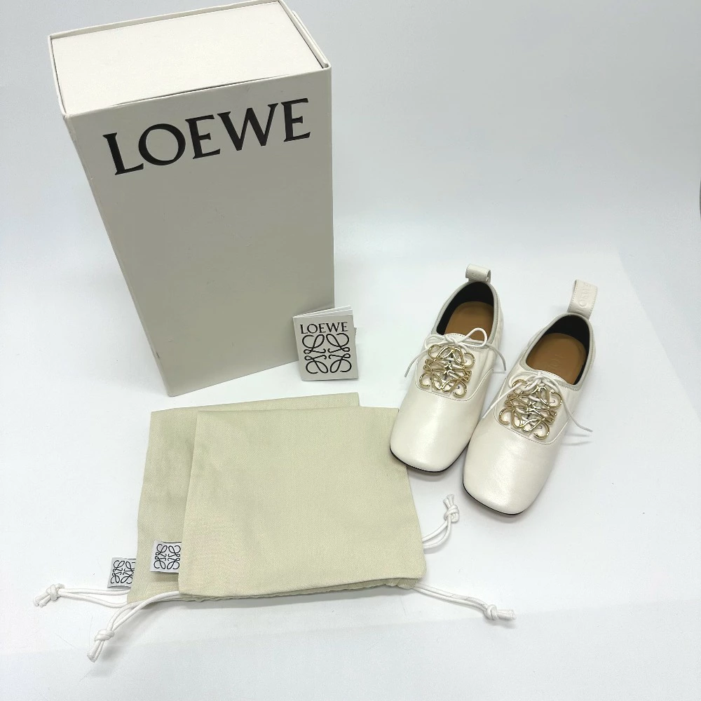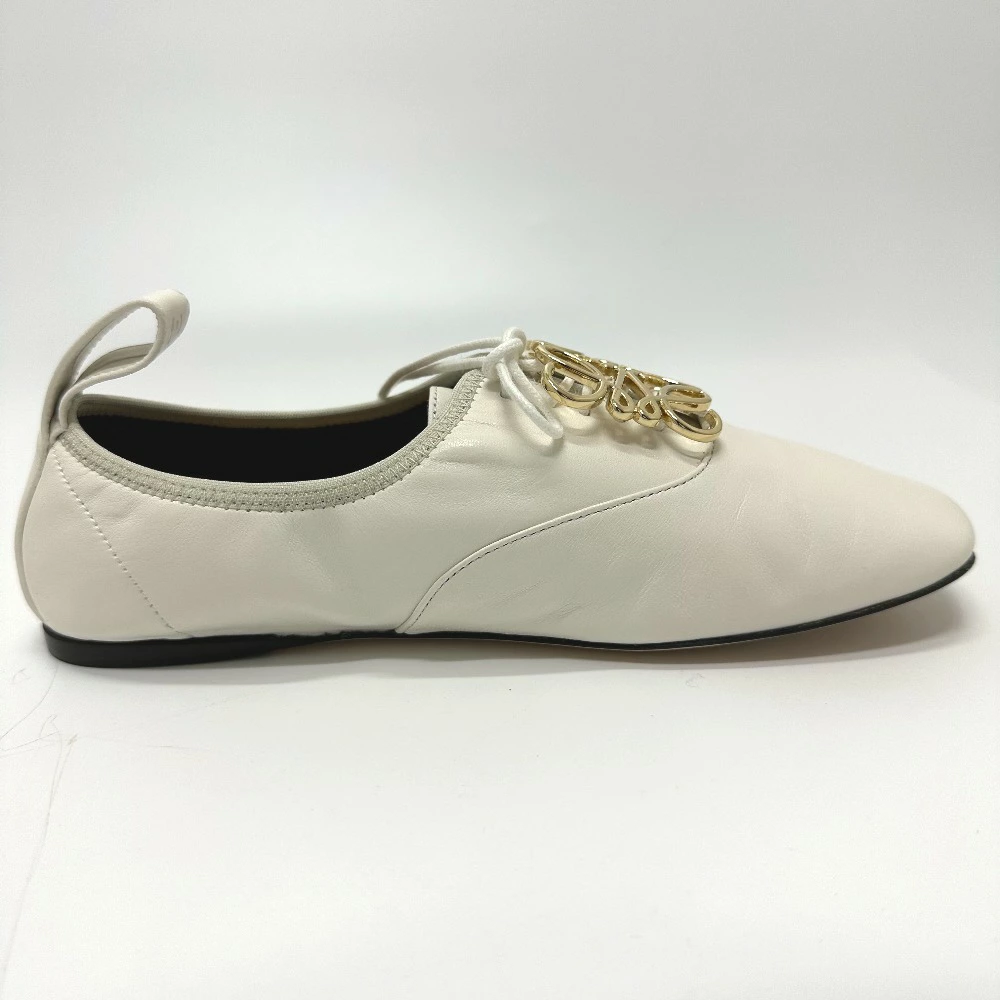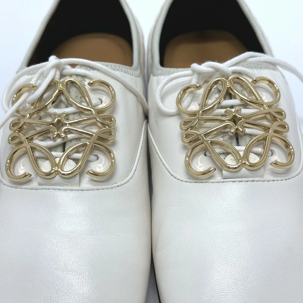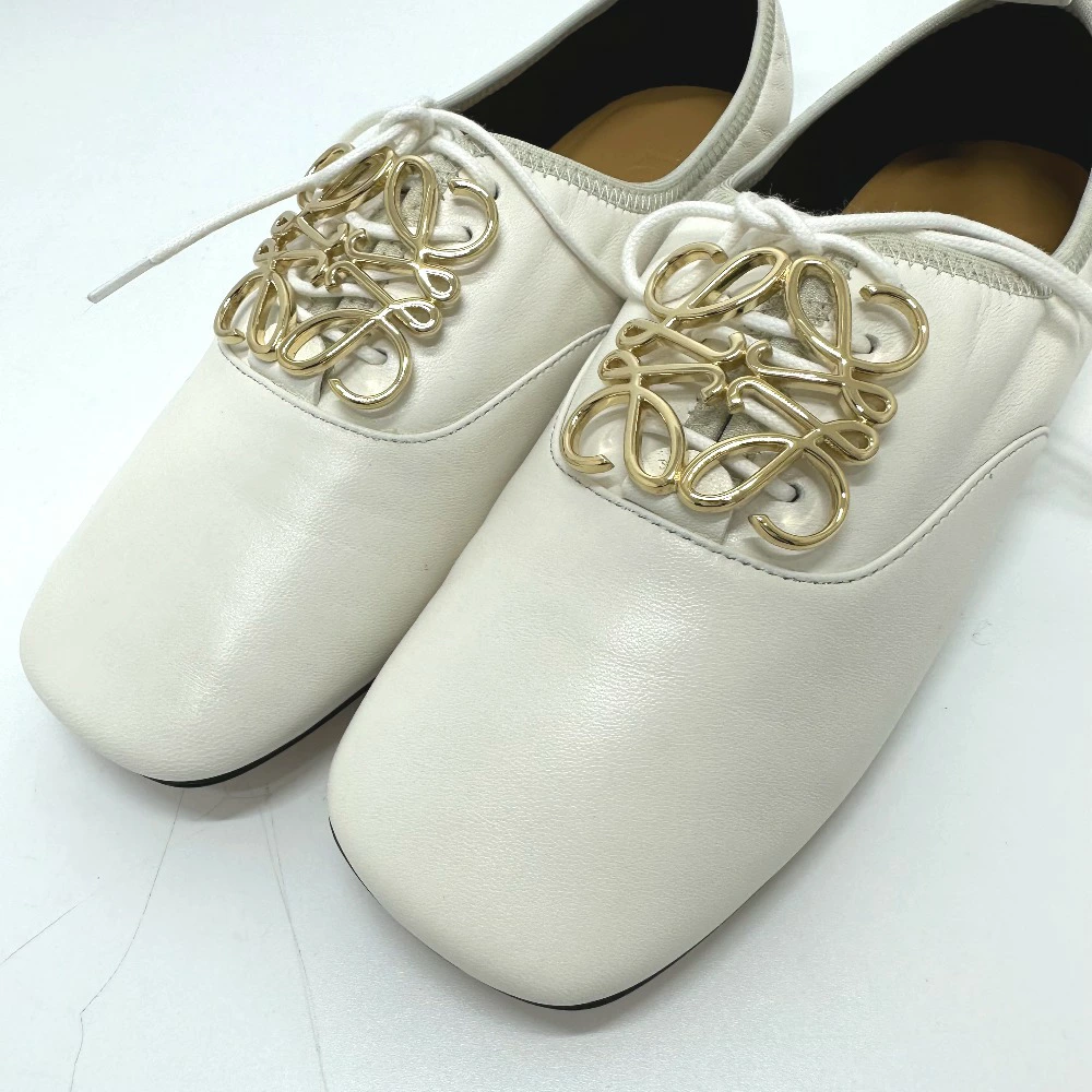 | 商品説明 | ロエベのゴールド金具がポイントのホワイトレザーシューズです。フラットソールに上質なレザーで歩きやすくおすすめのアイテムです。 |