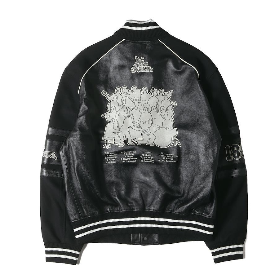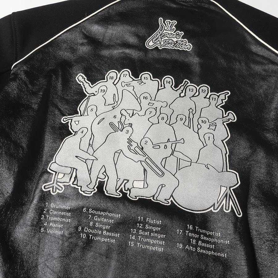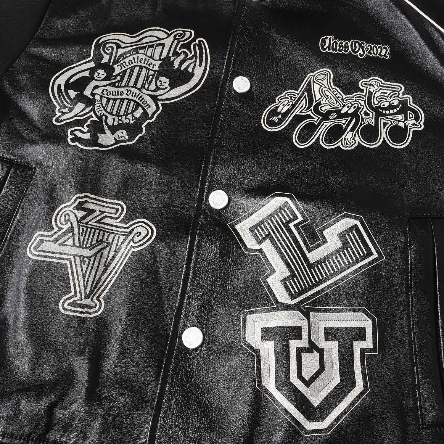 - 滑らかな風合いの高品質のラムレザーボディとしっかりとした厚みのあるウール素材をコンビで使用し、ミュージカルがテーマのグラフィックLVシグネチャーデザインがあしらわれ、アクセントのホワイトパイピング、ライン入りリブ編みショールカラー、フロントスナップボタン仕様で仕上げられたバーシティブルゾンです。