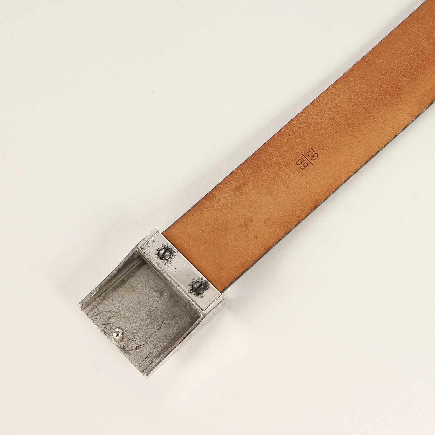 | サイズ | 80/32全長(バックル含む):約95.3cm 穴まで(バックルピンから):最短約74.5cm×最長約84.5cm×幅約2.8cm バックル:縦約3.4cm×横約3.7cm |