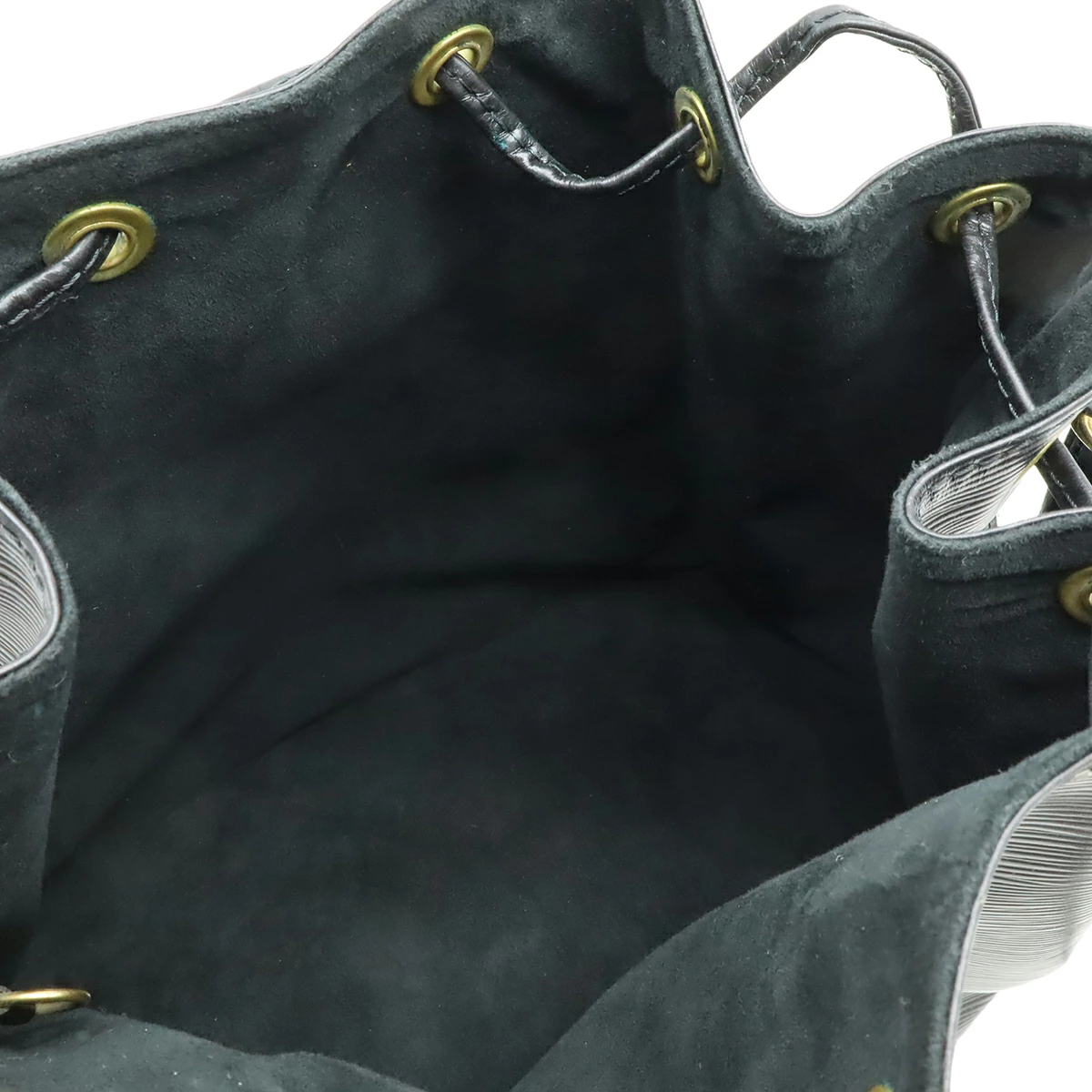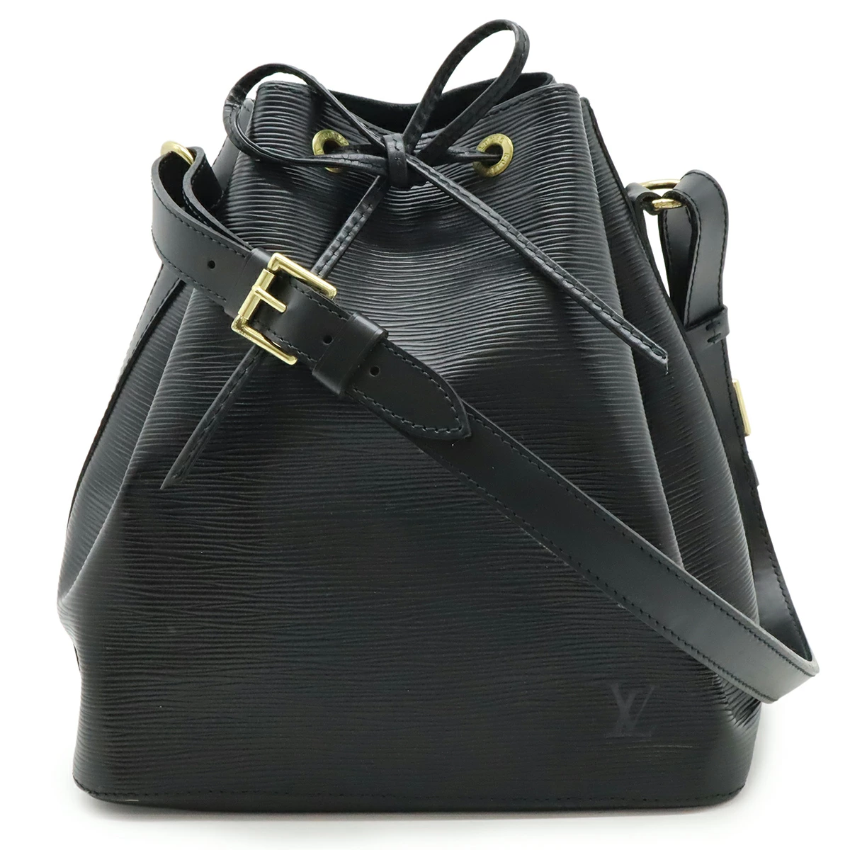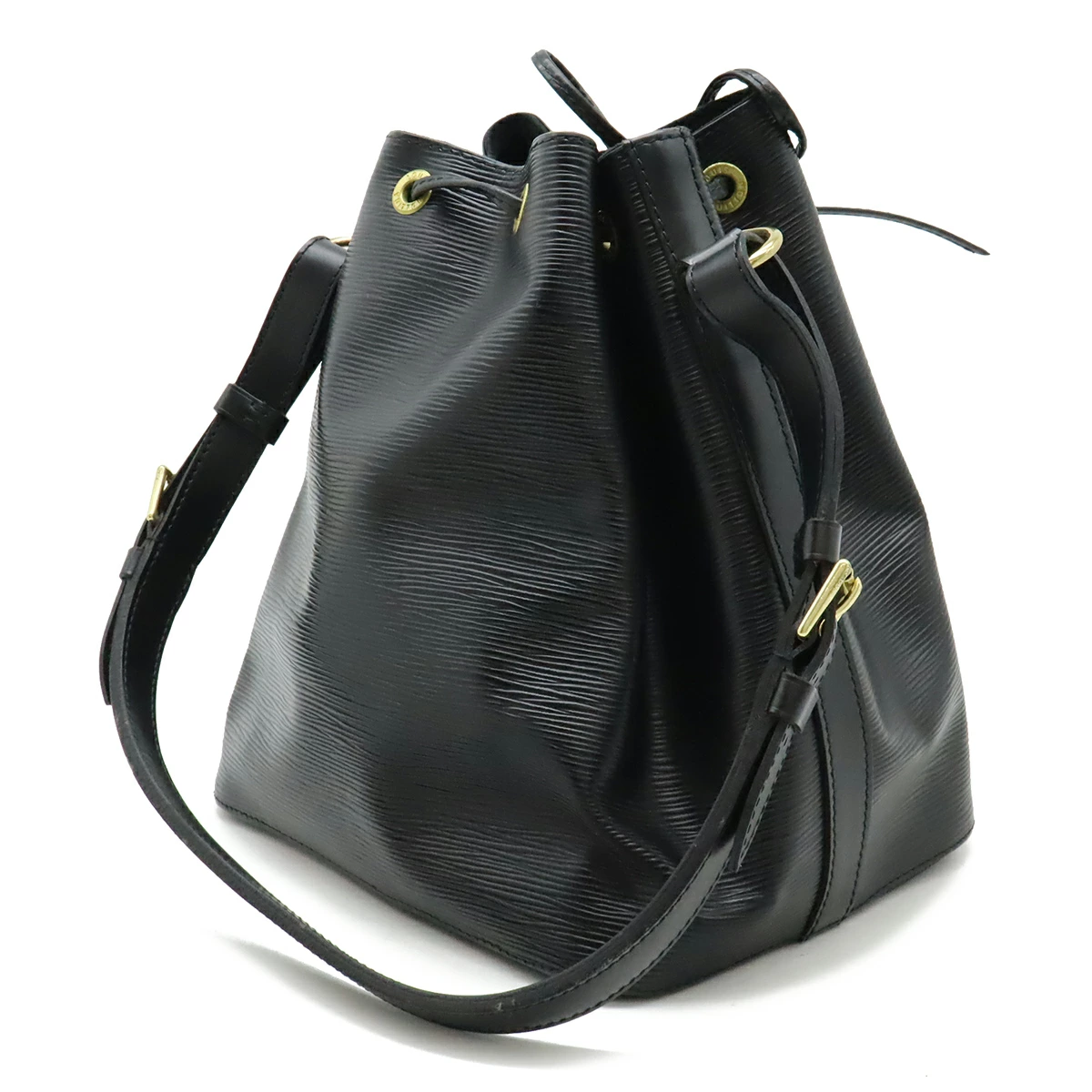 シックなブラックカラーの上質なエピレザーが高級感のある定番の巾着型ショルダーバッグ。