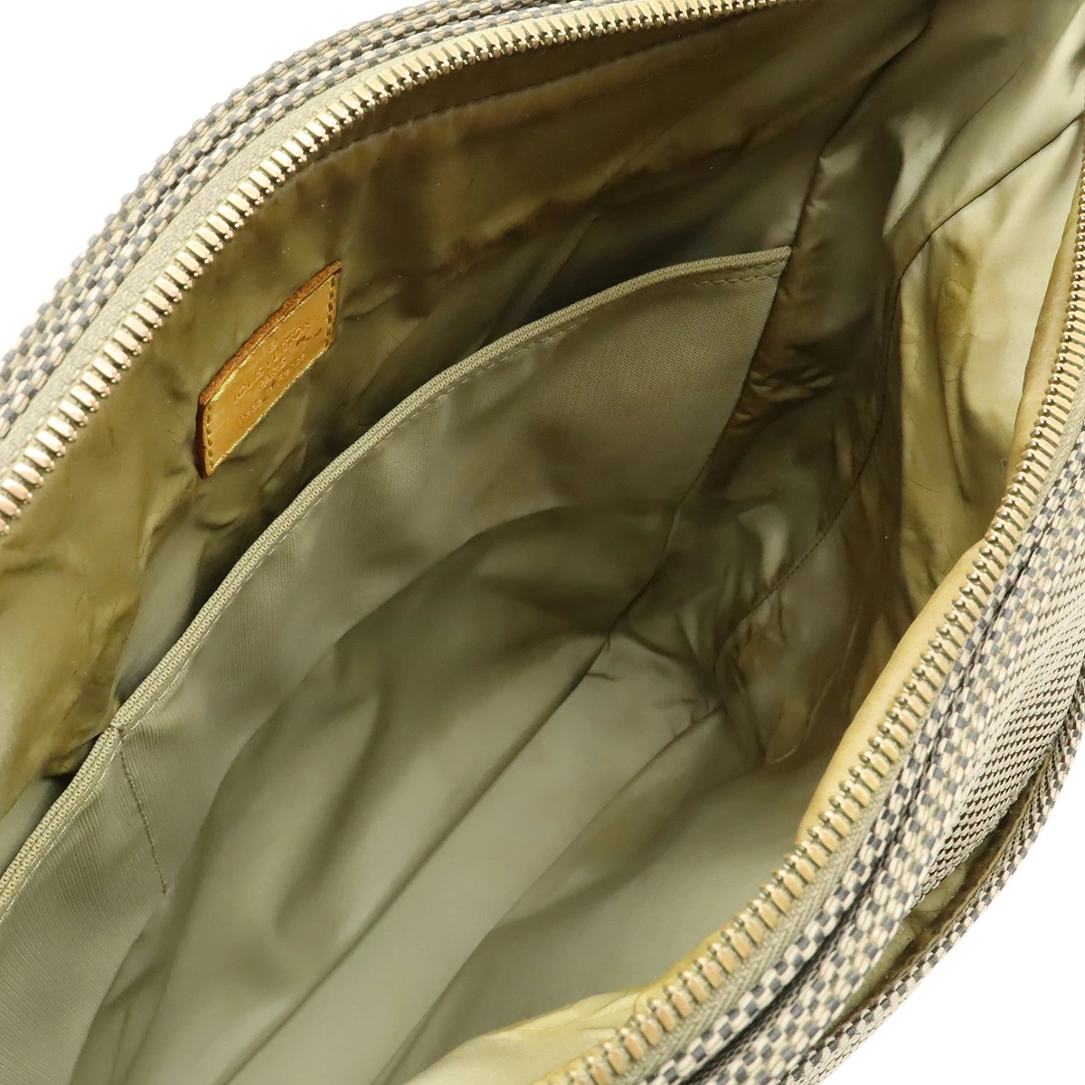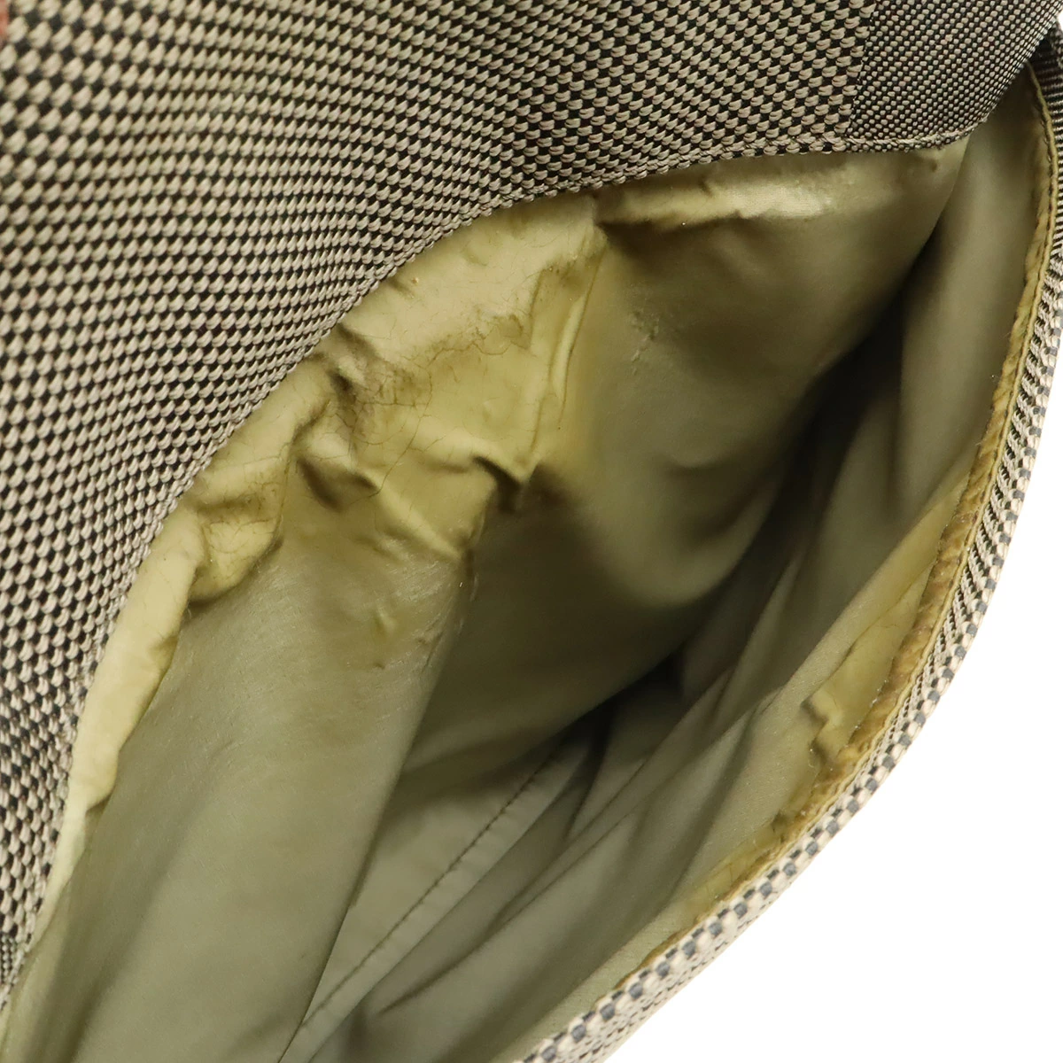 ヌメ革シミ、スレ、ヤケ、ヒビ、間口、角スレ、背面左ショルダー付け根糸ほつれ、若干のシミ