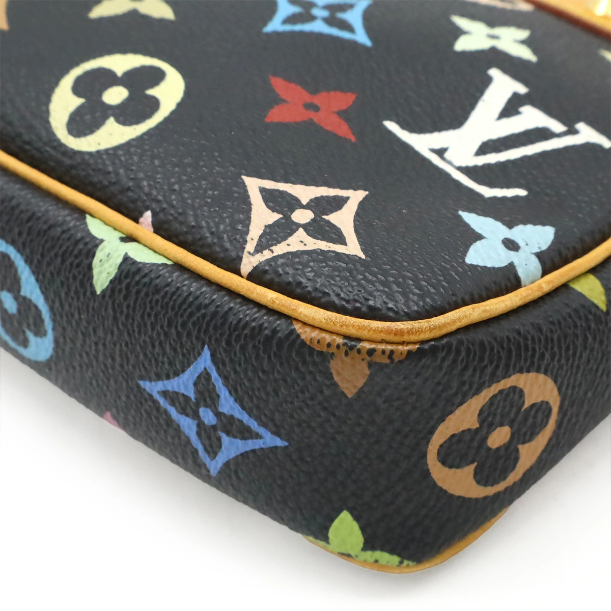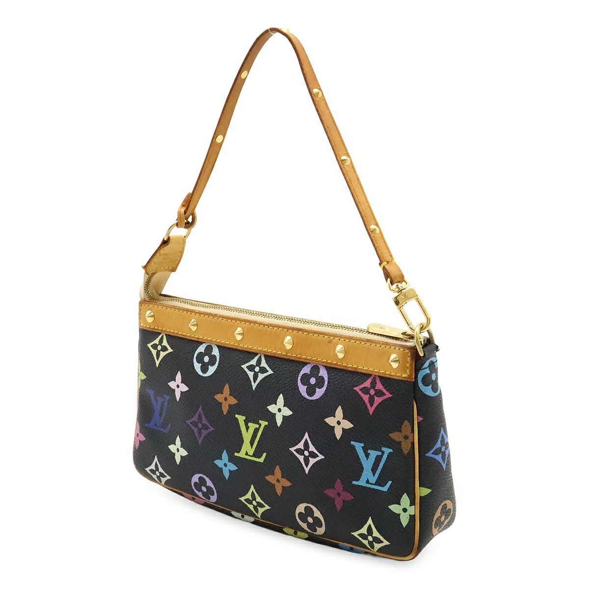 カラフルなロゴが全面に散りばめられた、ポップなデザインのオシャレなアクセサリーポーチでございます。