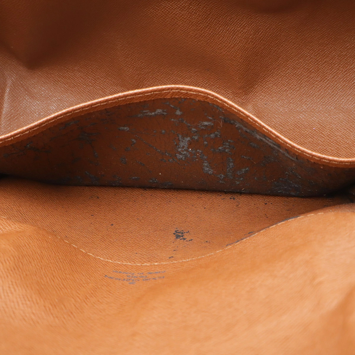 型崩れ、フチスレ、底面わずかな生地ヒビ、ヌメ革ヤケ、スレ、シミ、若干のヒビ