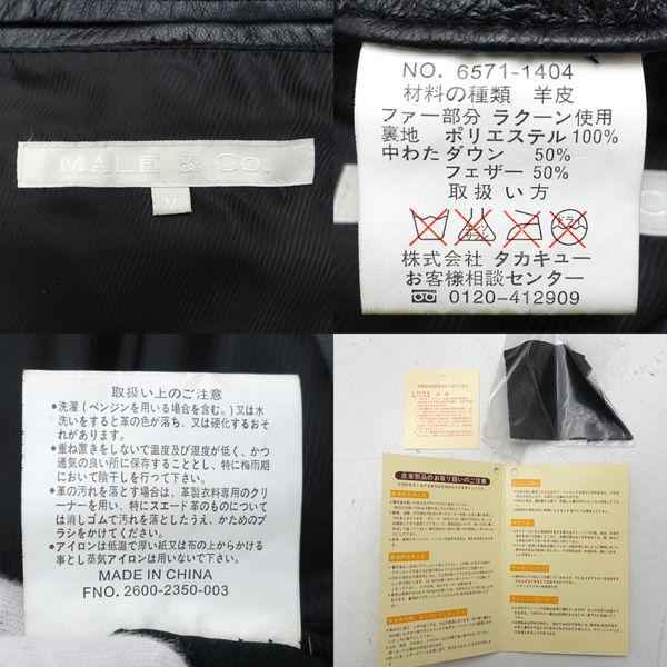 ・メーカー :MALE&Co. / メイル アンド コー・製品型番 :6571-1404・サイズ :表記サイズ:1574,肩幅 (約cm):47,身幅 (約cm):56,着丈 (約cm):71,袖丈 (約cm):62,・色(柄)の系統:ブラック・デザイン :(メンズ)アウター/ジャケット・素材 :羊革 ダウン50% フェザー50%