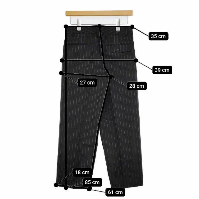 実寸サイズ | 総丈:約85cm ウエスト:約35cm 股上:約28cm 股下:約61cm ヒップ:約39cm ワタリ幅:約27cm 裾幅:約18cm ※採寸画像がある商品はハンガーに吊るした状態での計測のため、平置きでの採寸とは差が生じる場合がございます。平置きでの実寸サイズをご希望の場合は、ご購入前に必ずご質問ください。 ※記載以外のサイズが合わないことを理由とした返品はできませんので、 記載部分以外で実寸サイズの気になる箇所があれば必ず購入前にご質問ください。 |