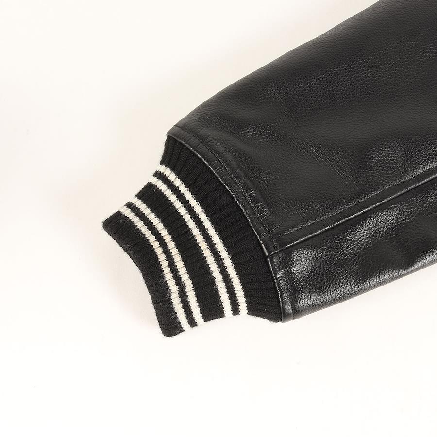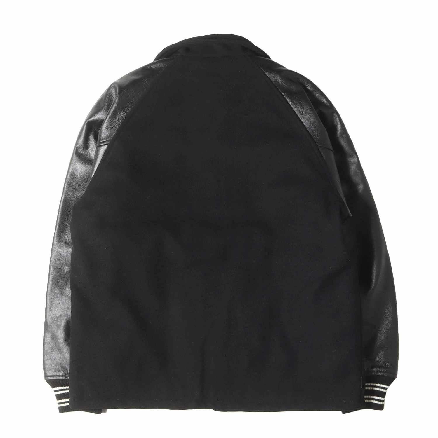 | 商品説明 | メルトンウールとカウレザーのコンビで仕上げた、裏地キルティングのクラブジャケットです。胸にロゴ刺繍をあしらったのみのシンプルなデザインになります。 |