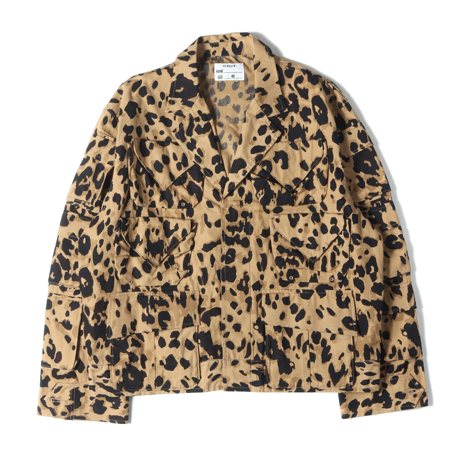- 1970年代の”U.S.NAVY TEST SAMPLE GRENADIER JACKET”をモチーフにした比翼ボタンミリタリージャケットです。ボディにはレオパード柄のコットンポプリン生地を使用しております。