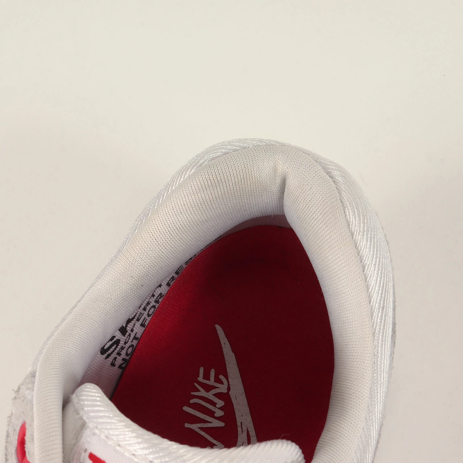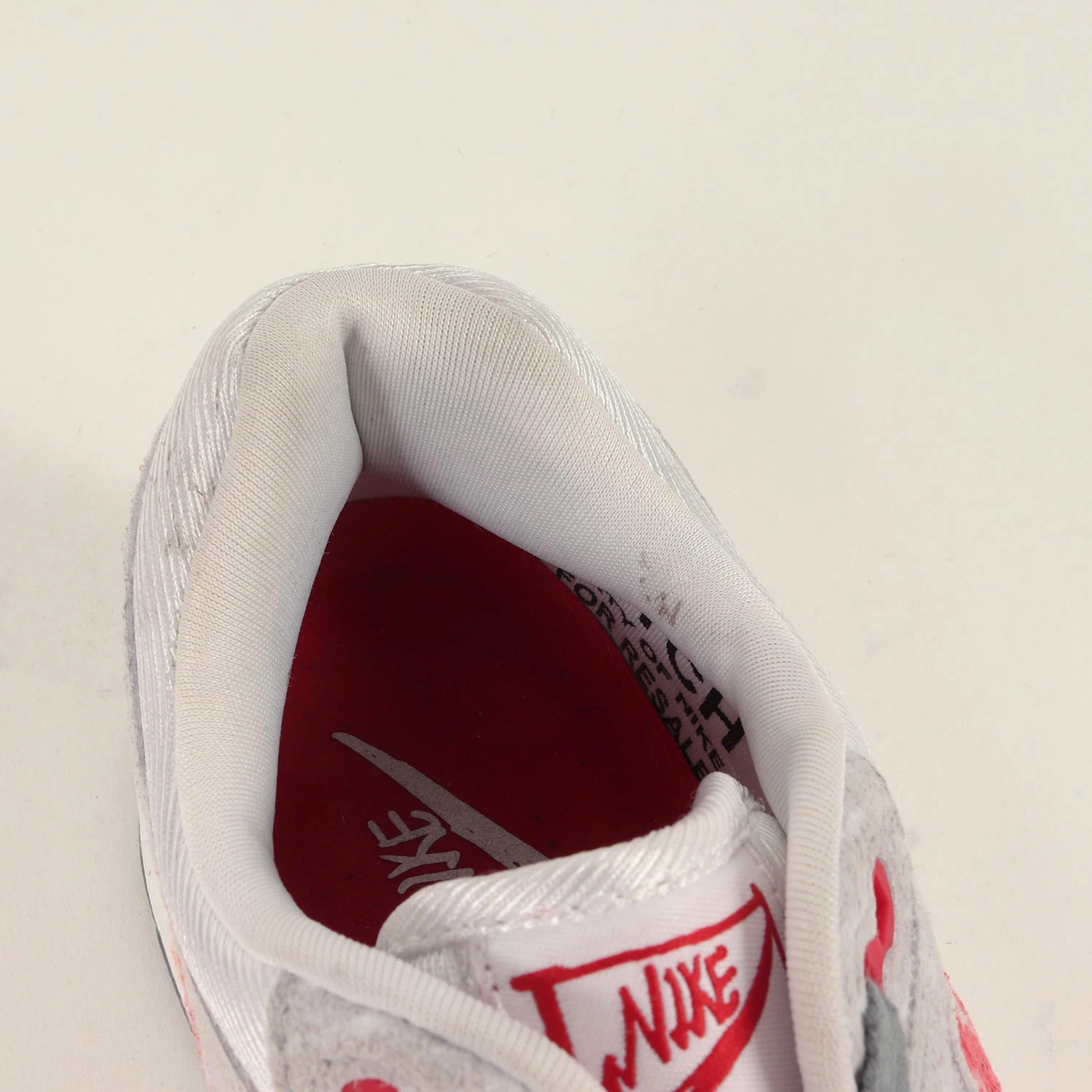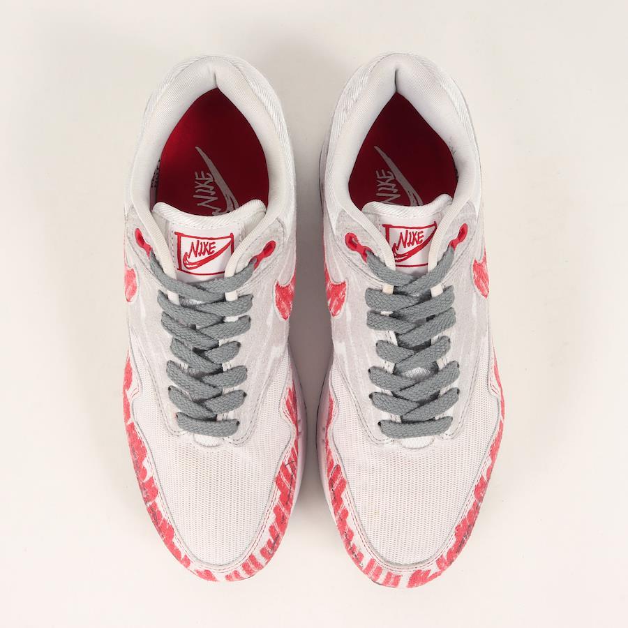 - こちらは“TINKER HATFIELD(ティンカー・ ハットフィールド)”が手描き風に塗りつぶし、手書きのフォントで随所にテキストをあしらったユニークな“AIRMAX 1(エアーマックス 1)”です。クリアのアウトソールにはソールのパターンをイラスト風にデザインしています。