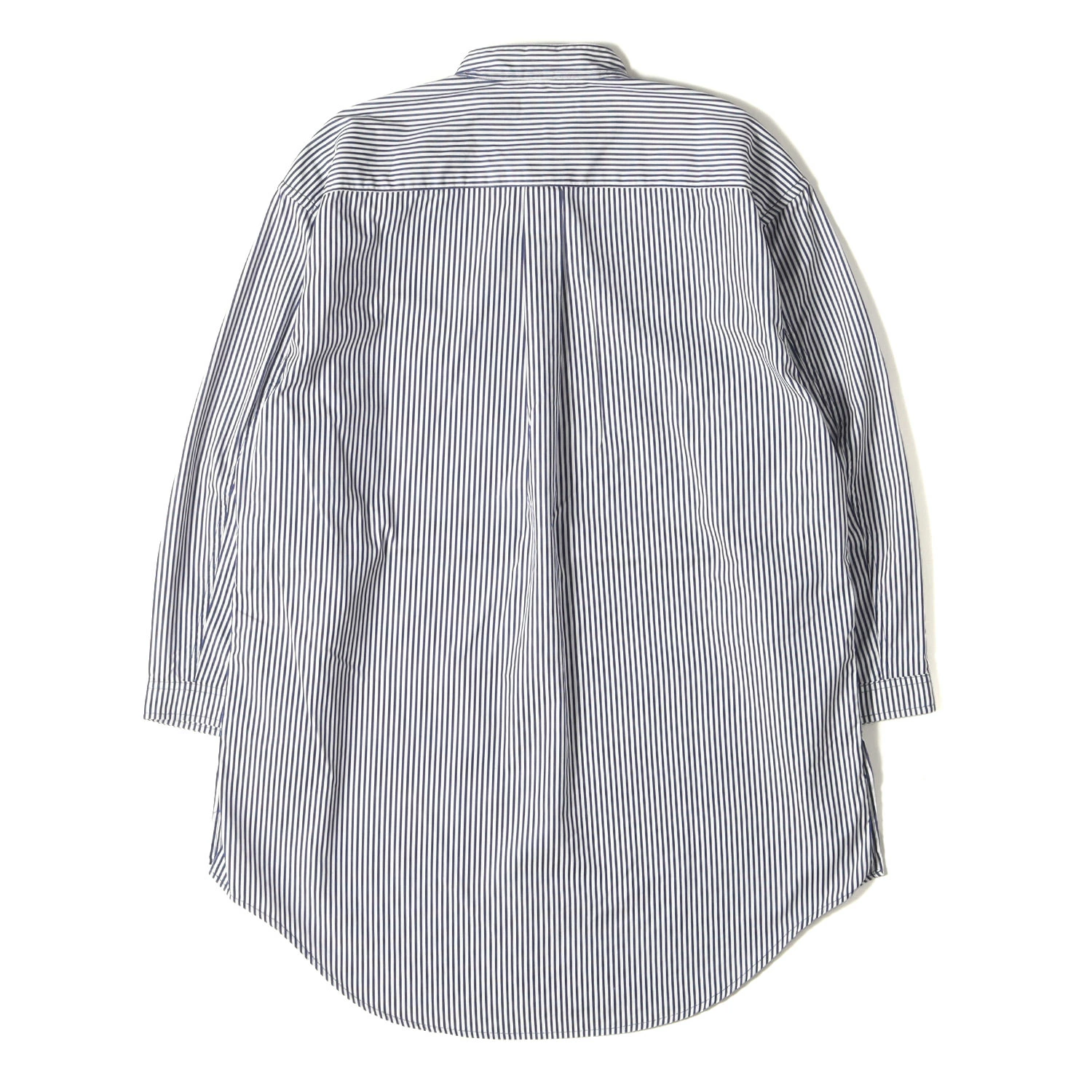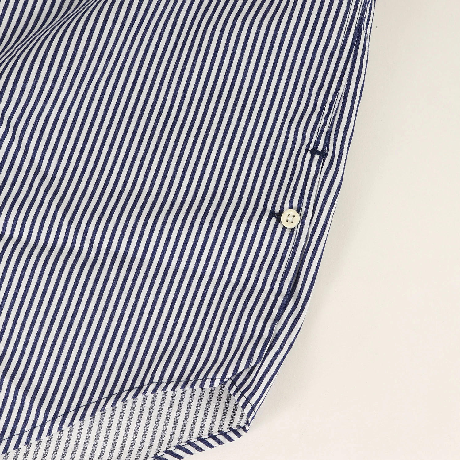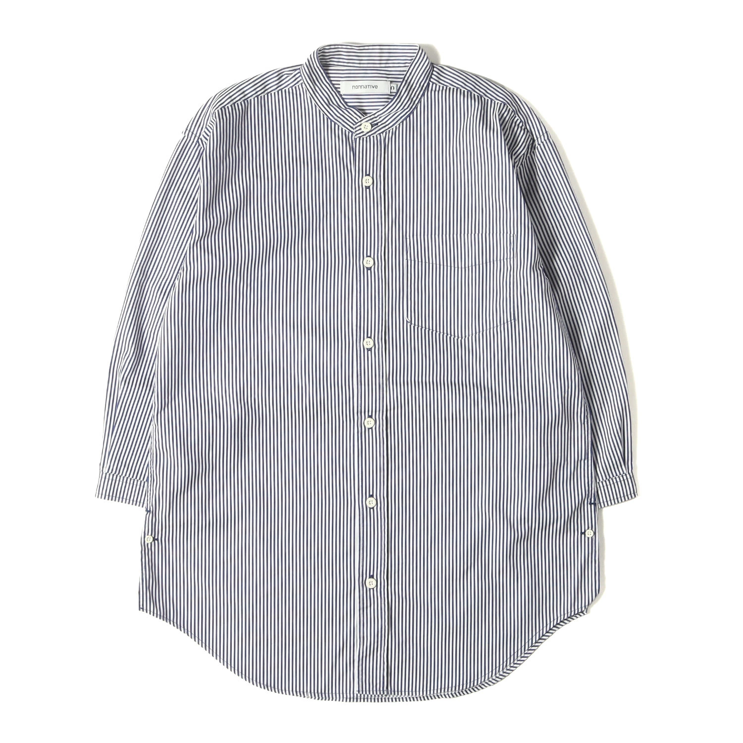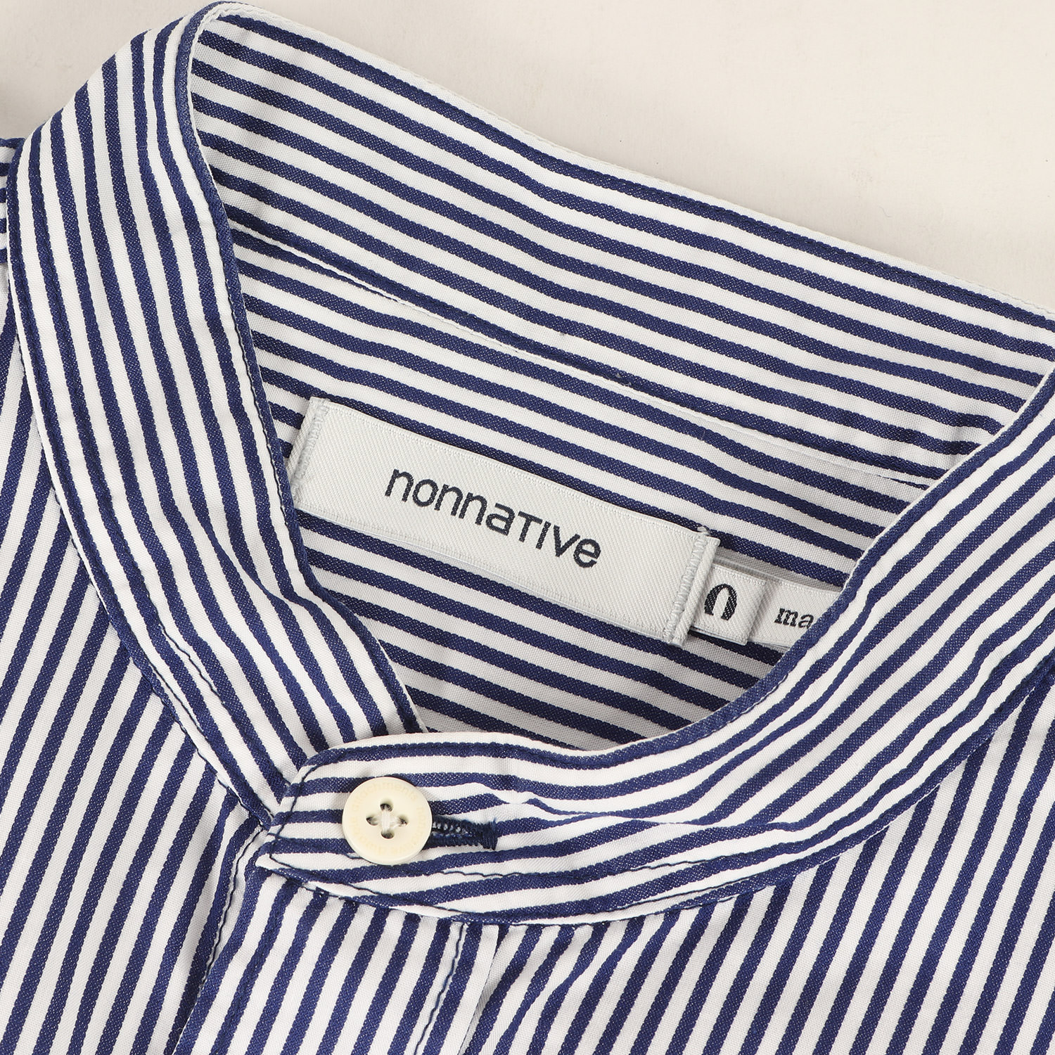 NONNATIVE Shirt, Navy/White, Size: 0 / 20SS, Band Collar, 3/4 Sleeve Striped Shirt (OFFICER SHIRT Q/S RELAXED FIT C/P SATIN LONDON STRIPE COOLMAX) | Men's Casual Long Sleeve Shirt (Pre-owned) [K4614]