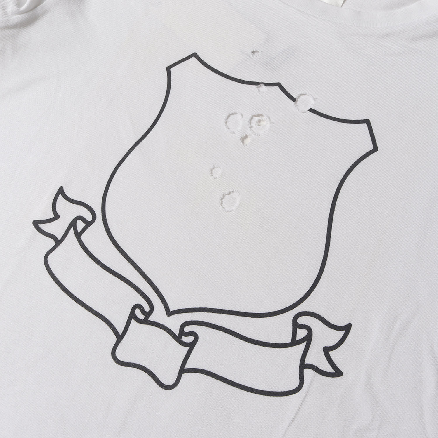 - こちらは2001年秋冬コレクション“STANDARD期”にリリースされたグランジデニムパンツです。こちらは薬品で穴あき加工を施したエンブレムTシャツになります。