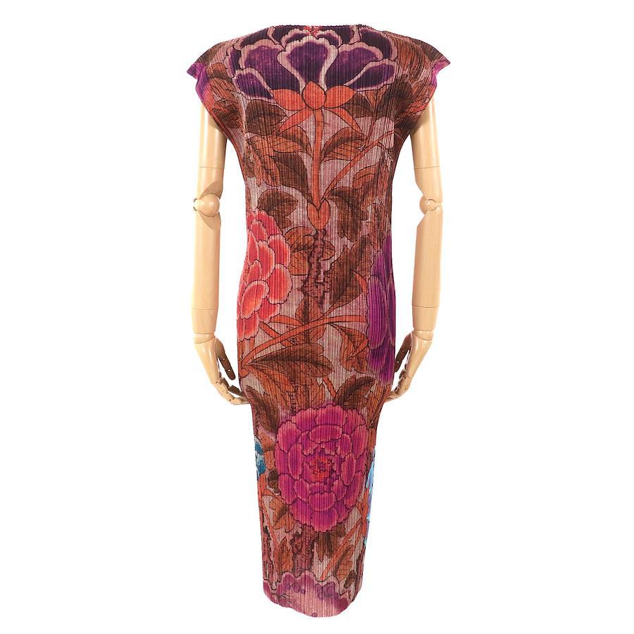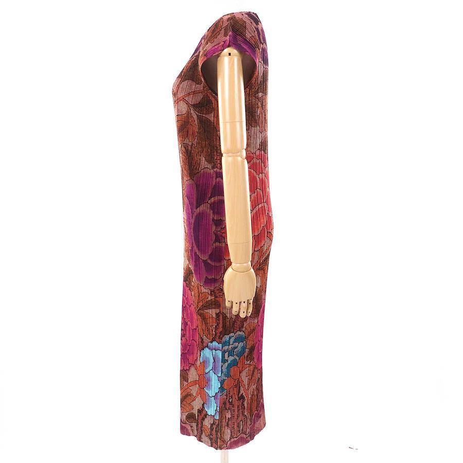 PLEATS PLEASE Peony Botanical Flower Print Dress, Rare, Cap Sleeve, Long, Brown, Multicolor, Polyester, PP84-JH777
