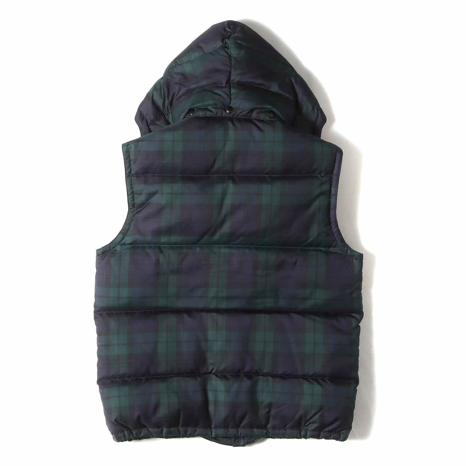 クラシカルなブラックウォッチチェック柄のポリエステル素材を使用し、取り外し可能なフードをデザインしたダウンベストになります。