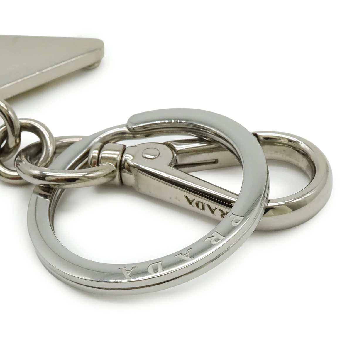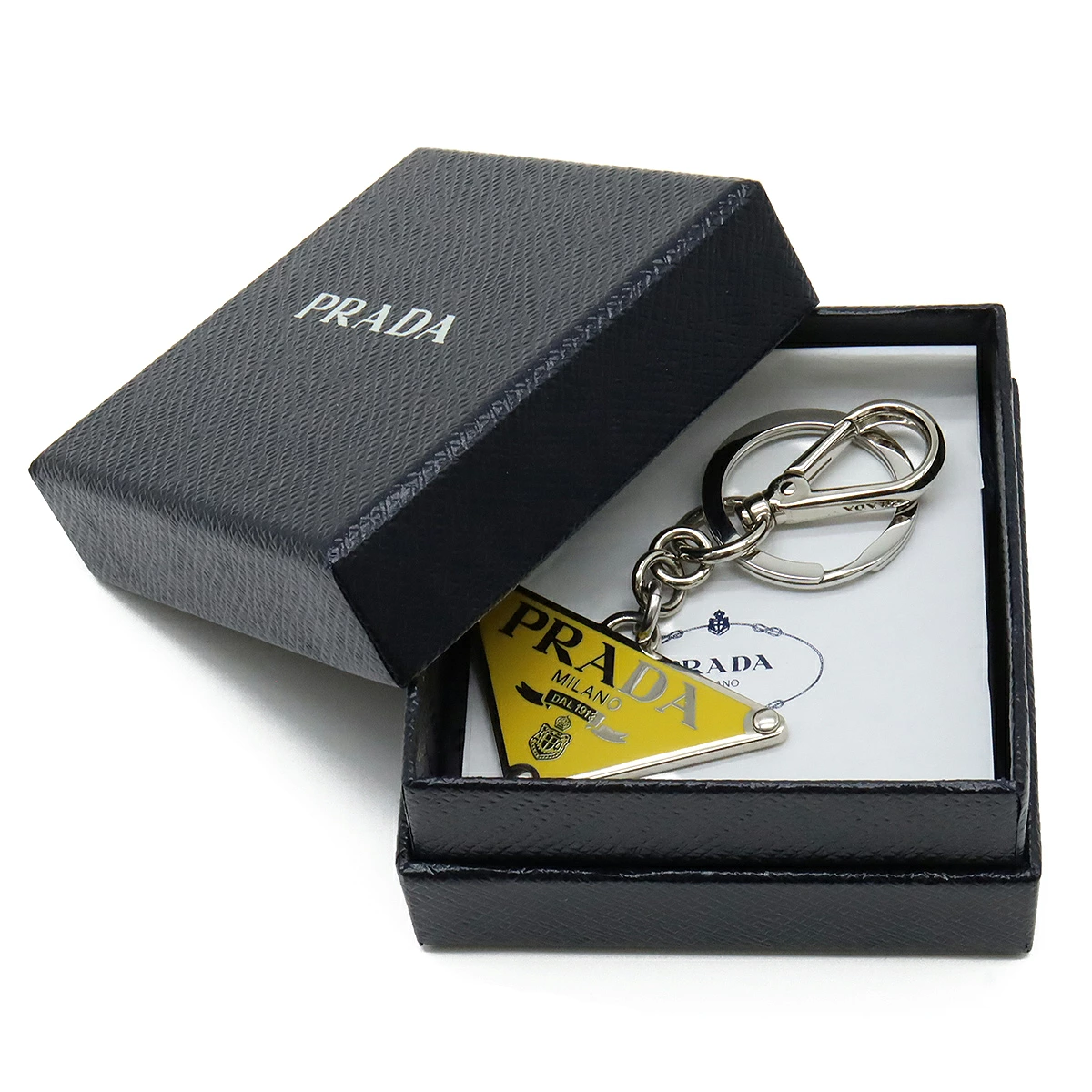 プラダの代表的なロゴプレートをかたどったオシャレなキーホルダーでございます。