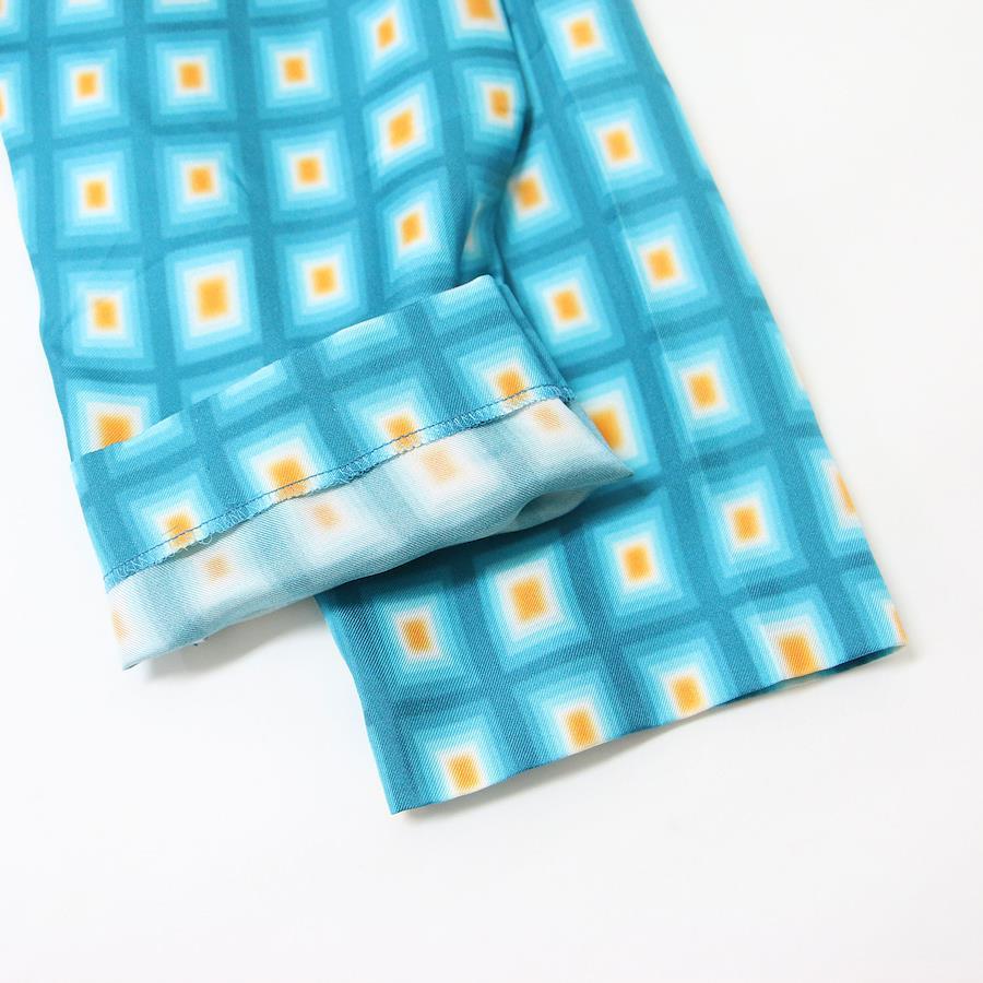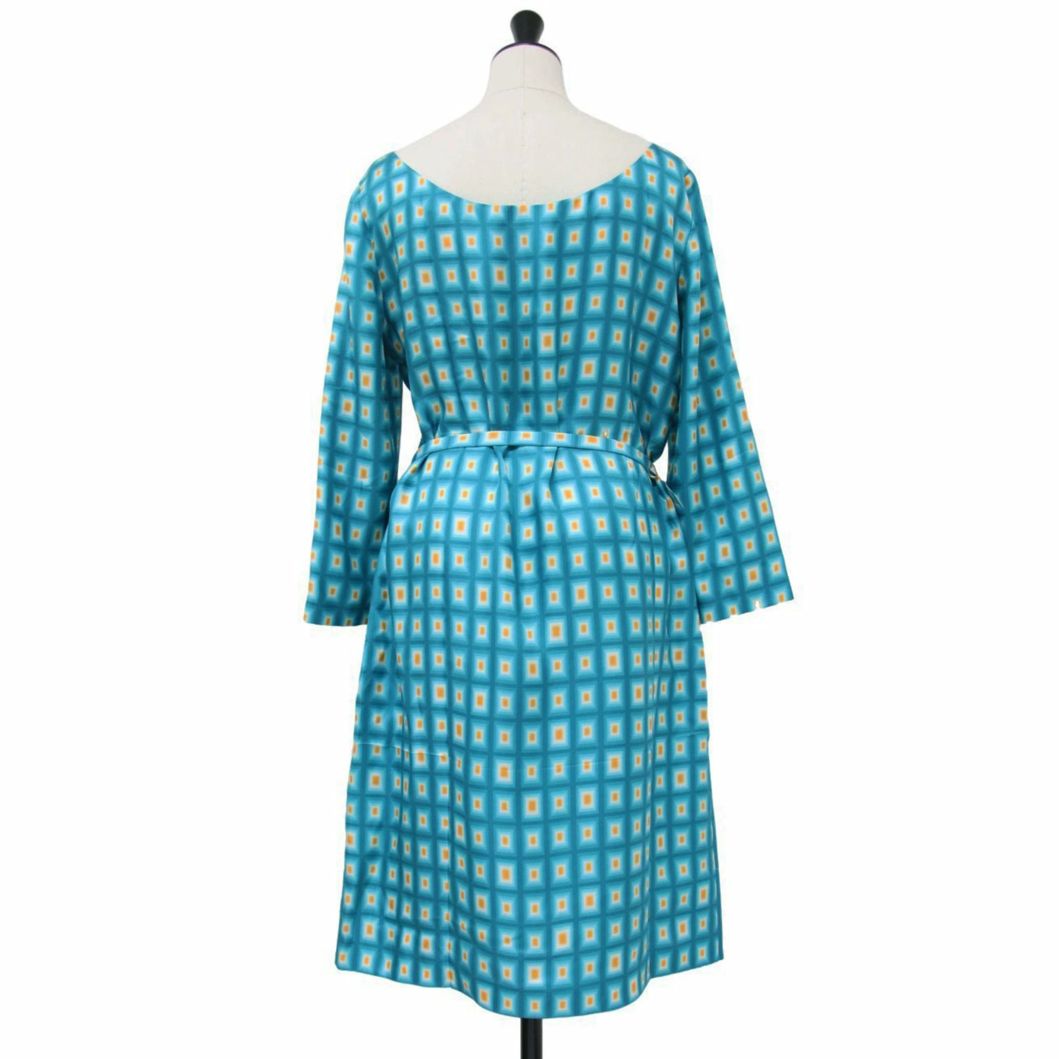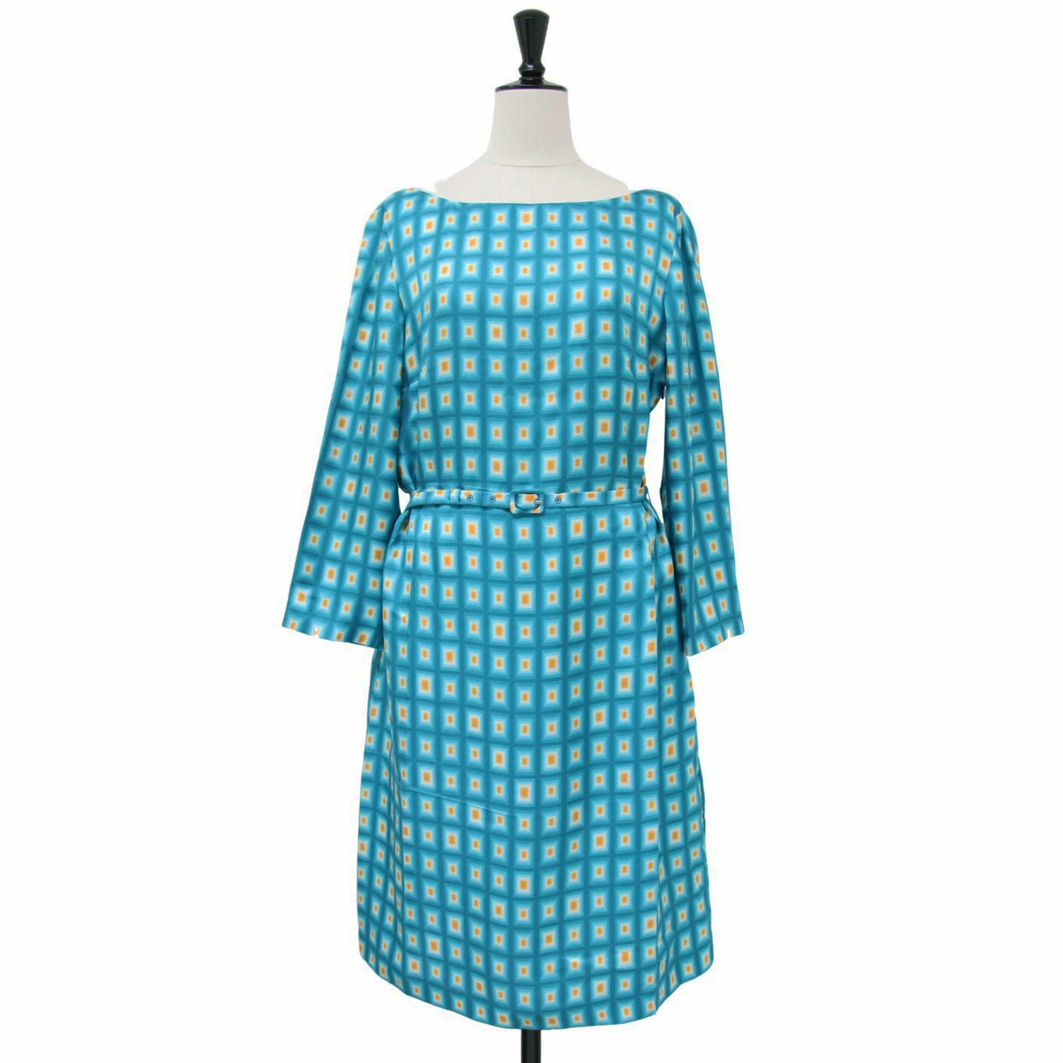 PRADA Light Blue Dress, Size 42 (XL), Square Print, Silk, Midi Length, Long Sleeves, All-Over Print, Wide Neck, Belted Top. Pre-owned. Women's. [K4305]