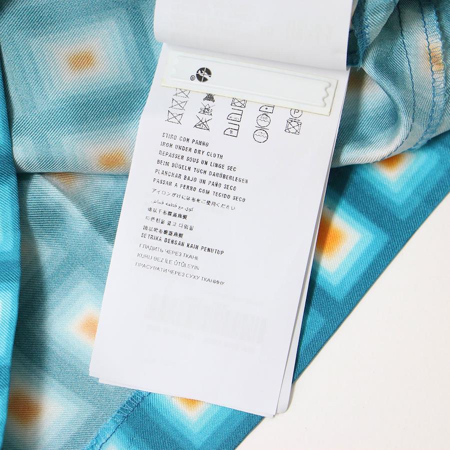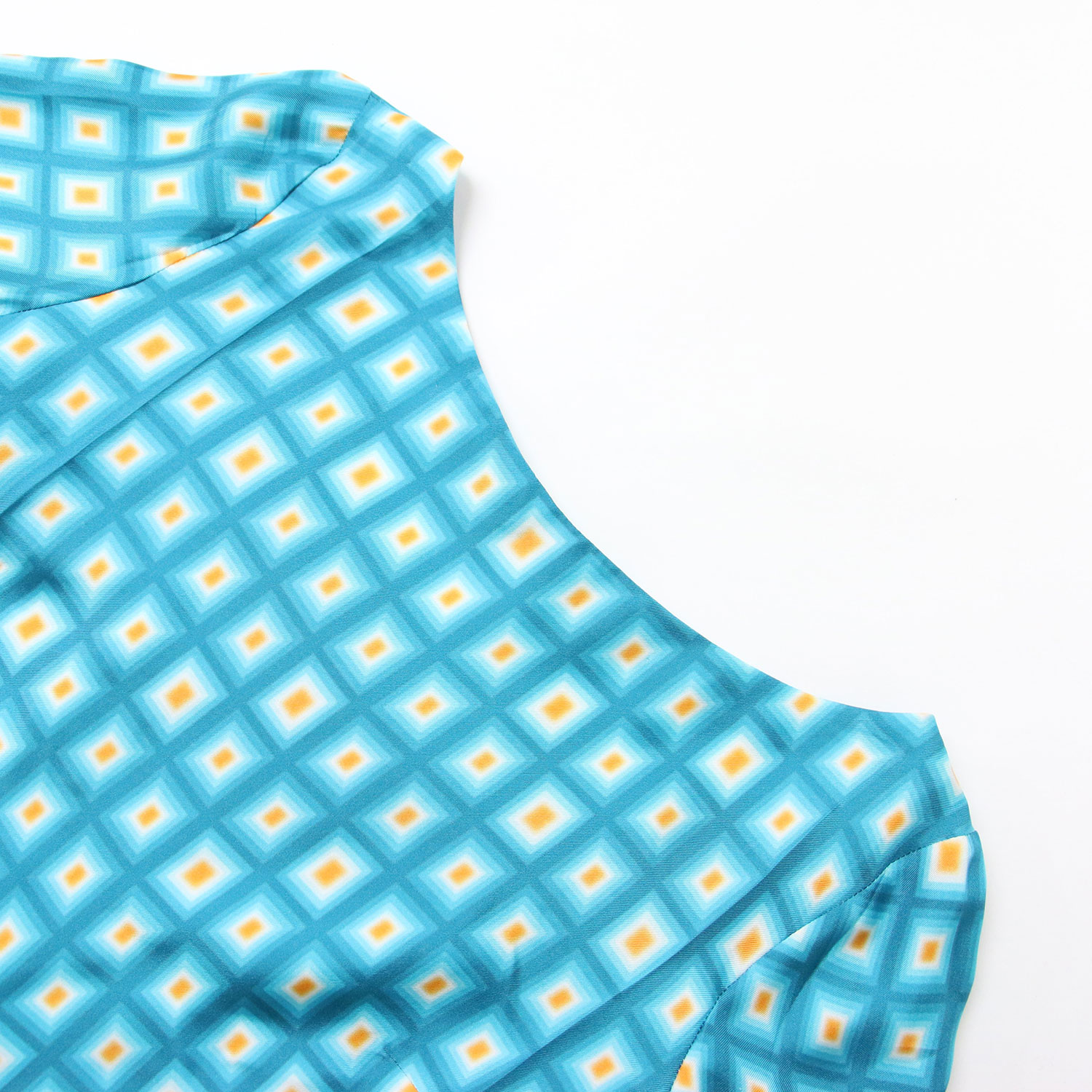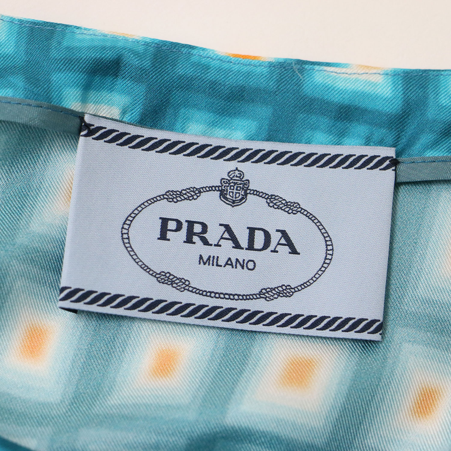 PRADA Light Blue Dress, Size 42 (XL), Square Print, Silk, Midi Length, Long Sleeves, All-Over Print, Wide Neck, Belted Top. Pre-owned. Women's. [K4305]