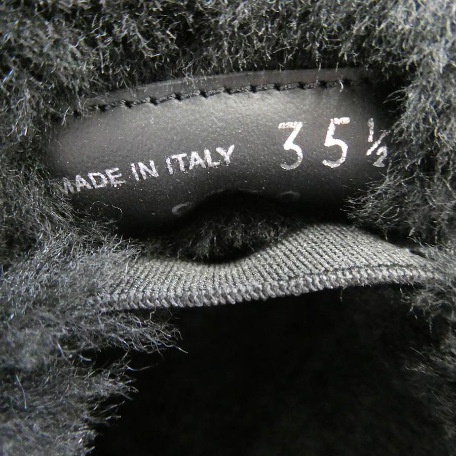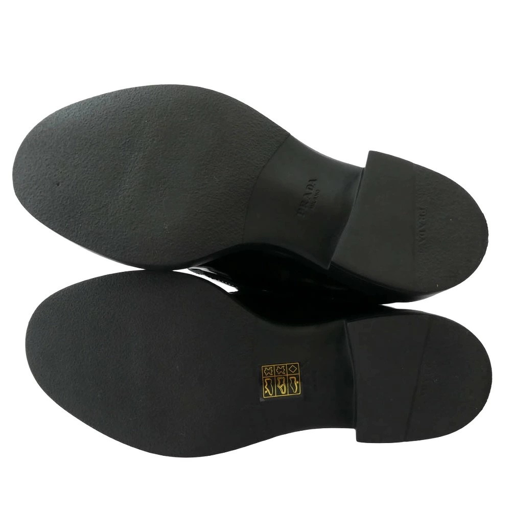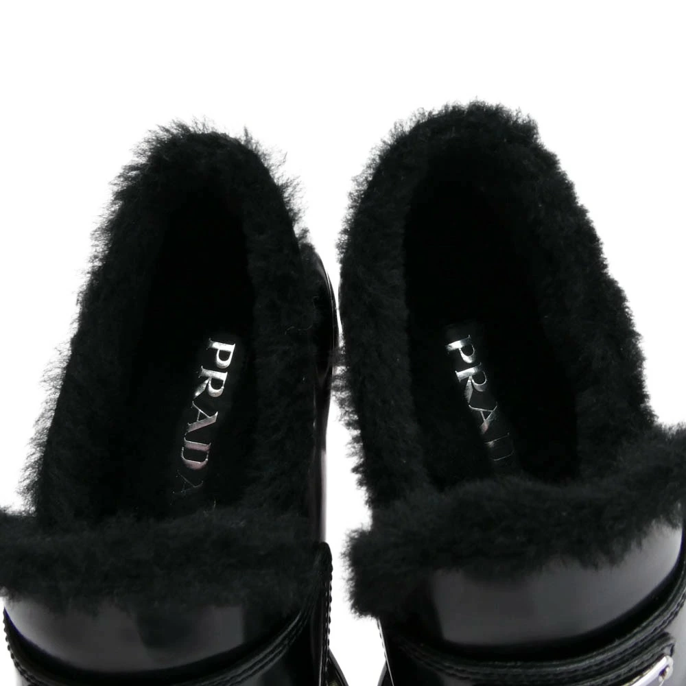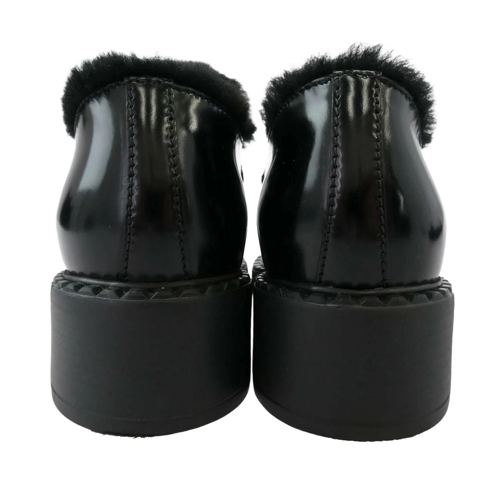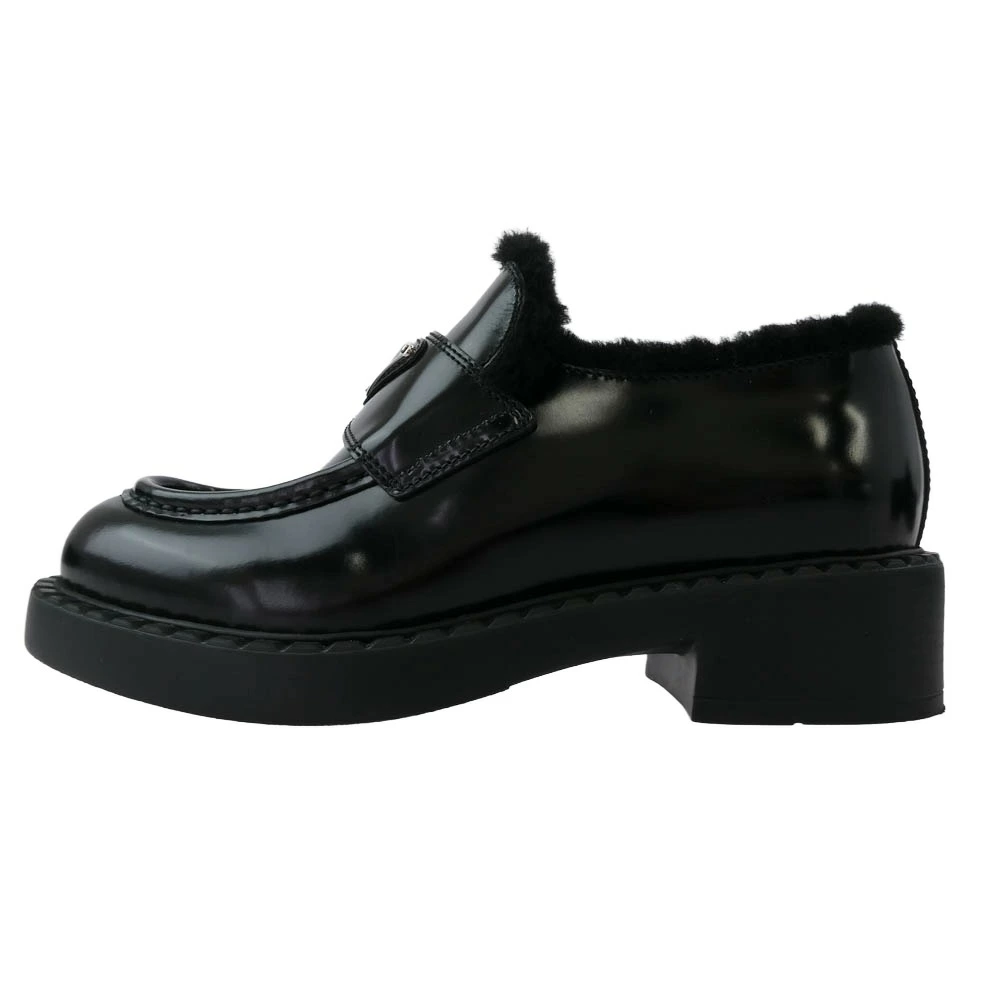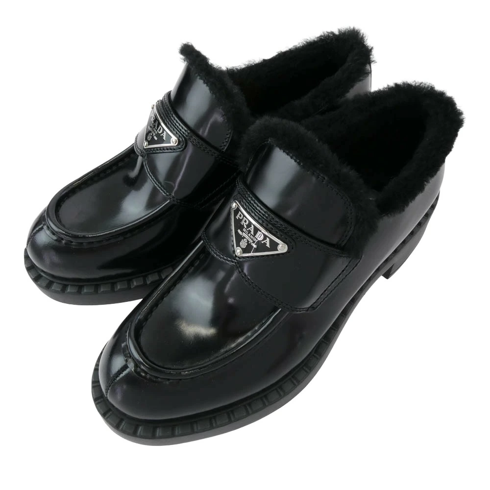 Pre-owned PRADA Prada 8830 Blessed Leather Triangle Plate Chocolate Fur Loafers, Black, Size 35.5, Women's