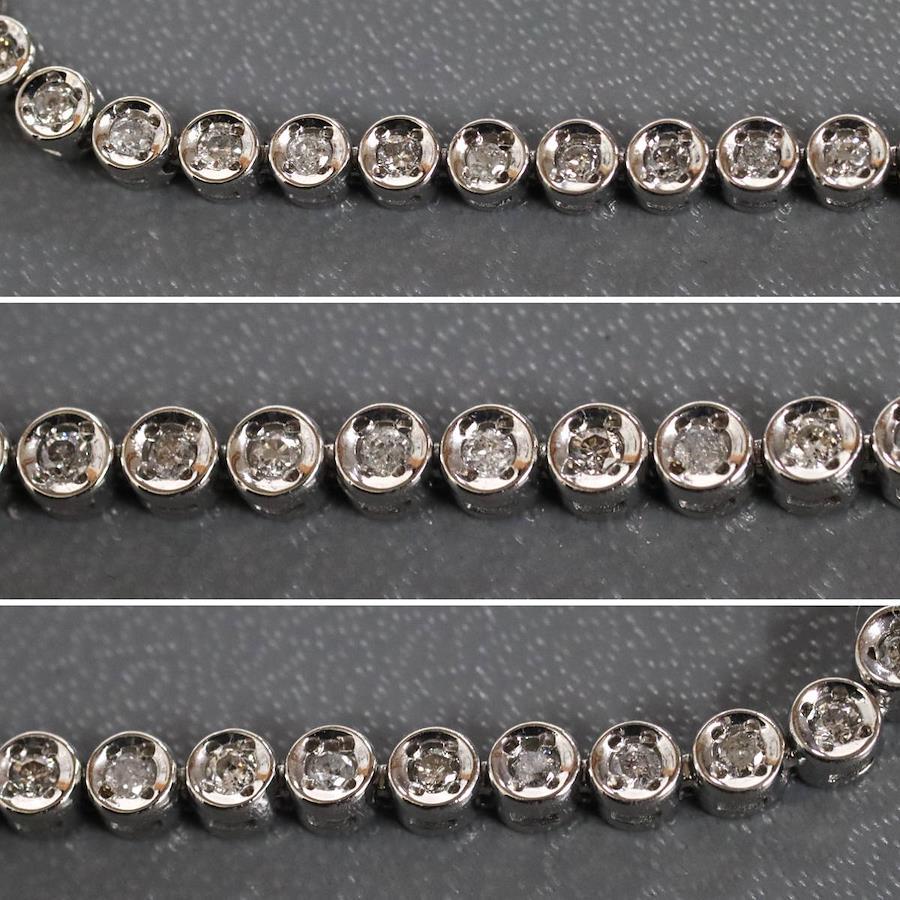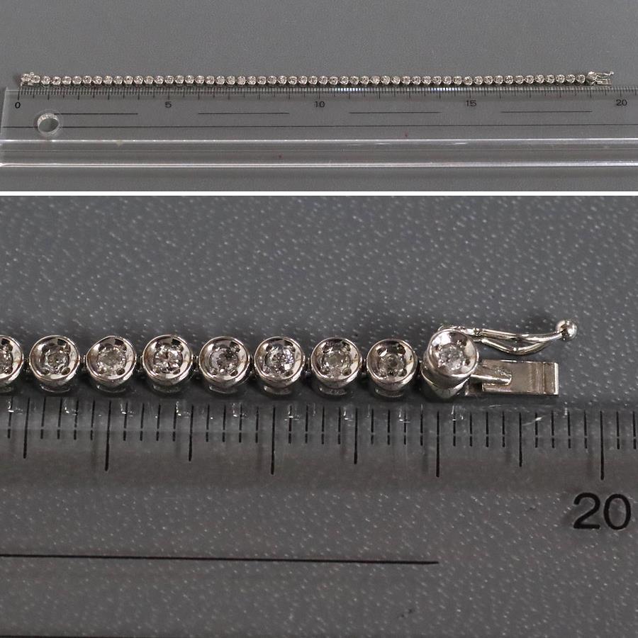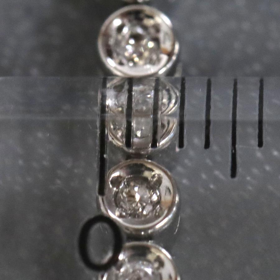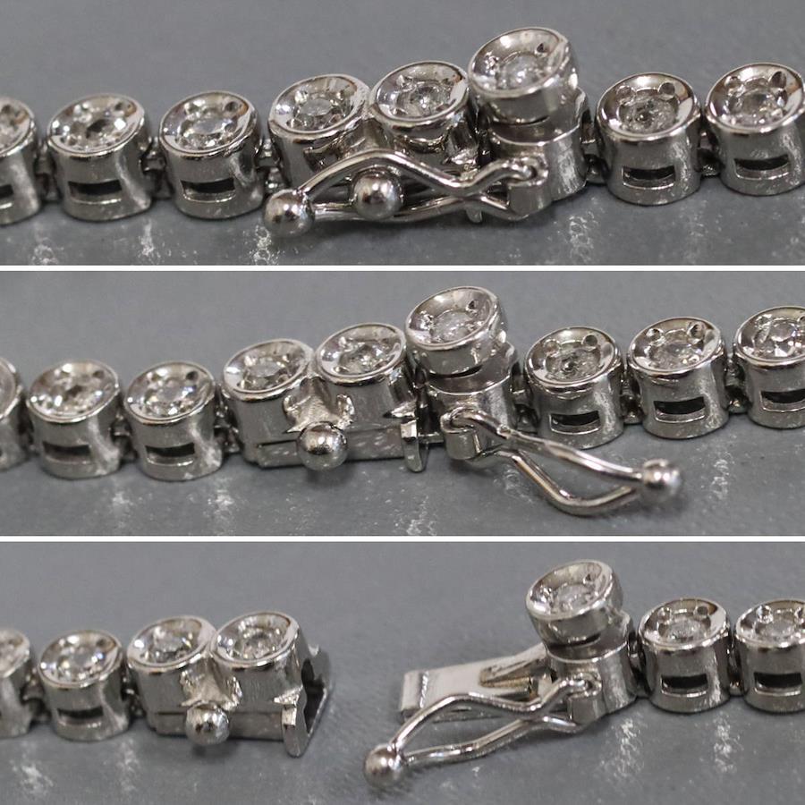 Pt850ダイヤモンドテニスブレスレットの中古品です。ダイヤモンドはどの石にもカーボン状のインクルージョンなどが多くあり、肉眼で見えるものもあります。プラチナがきらきらと輝くため、華やかに見えます。腕回りは約19cmです。地金には小傷があります。+---+---+---+---+---+。{状態}B{素材}Pt850,ダイヤモンド{サイズ}約19cm。幅約3mm。{その他}D1.00ct,13.7g。{付属品}なし(サービス箱をお付けします){お問合せ商品番号}25106035+---+---+---+---+---+。