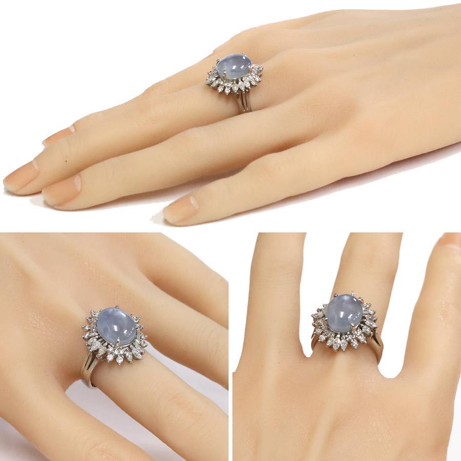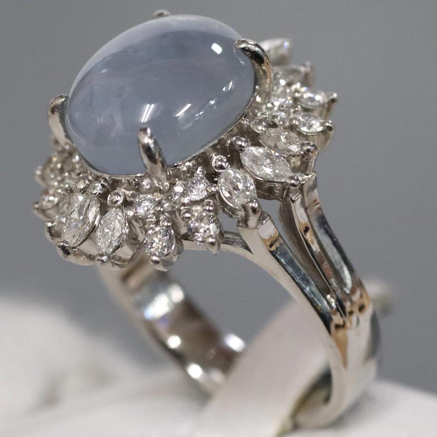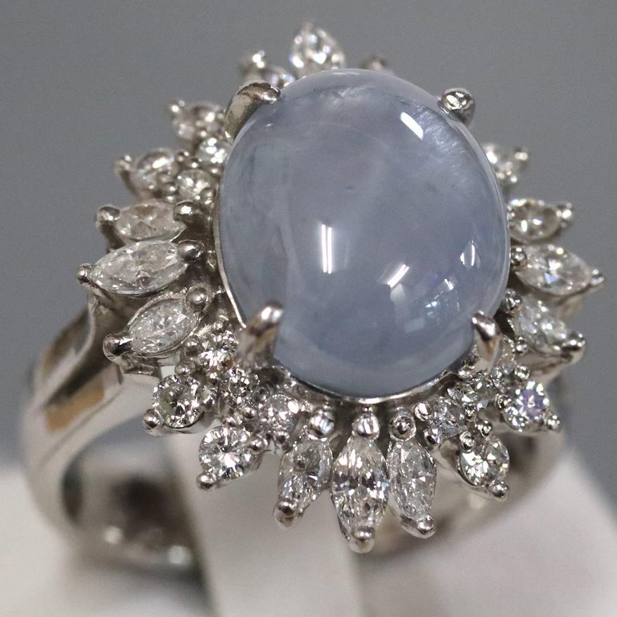 Pt900スターサファイアダイヤモンドリングの中古品です。スターサファイアは強い光を当てると6条の光が出ますが、スター効果は弱めです。サファイアはインクルージョンがあり、肉眼でも確認できます。ダイヤモンドは無色に近い色味で、全体的にややインクルージョンがありますが、照りよく輝きます。地金には小傷があります。+---+---+---+---+---+。{状態}B{素材}Pt900,スターサファイア,ダイヤモンド{サイズ}当店計測約#16{リング幅}約4-22mm。{その他}S11.510ct,D1.05ct,14.6g。{付属品}なし(サービス箱をお付けします){お問合せ商品番号}26030021+---+---+---+---+---+。