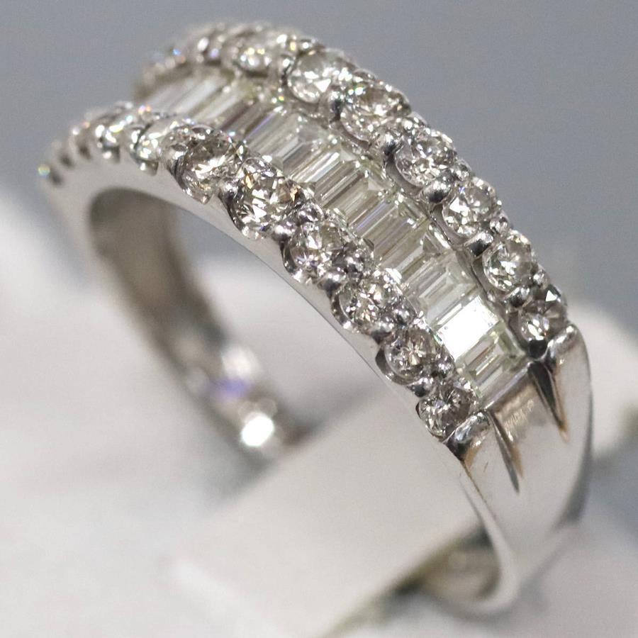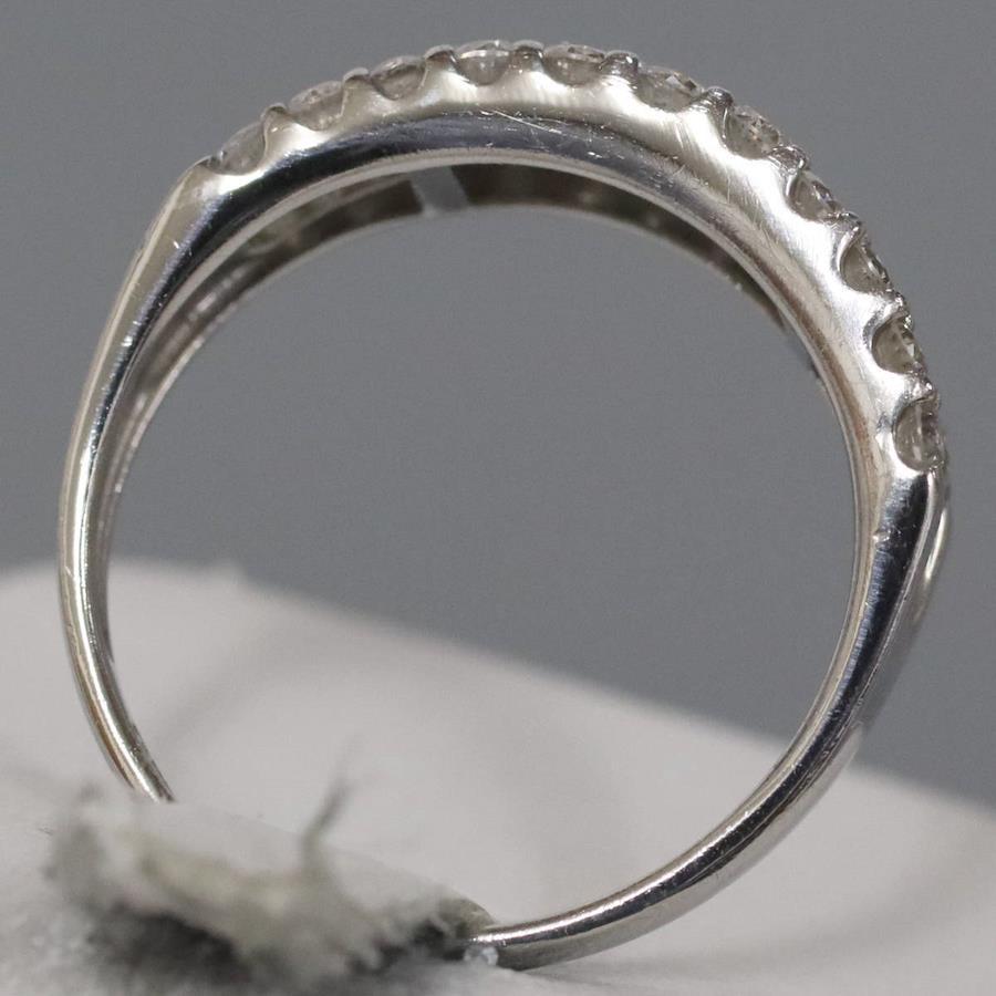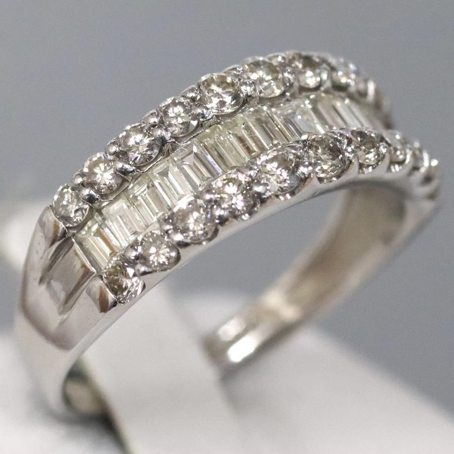 Pt900ダイヤモンドリングの中古品です。センターにはテーパーダイヤモンドがレールセッティングでセットされています。ダイヤモンドはややインクルージョンがありますが、照りよく輝きます。リングは完全な円形ではなく、やや楕円形になっています。地金には小傷があります。+---+---+---+---+---+。{状態}AB{素材}Pt900,ダイヤモンド{サイズ}当店計測約#11.5{リング幅}約2-7mm。{その他}D1.00ct,3.7g。{付属品}なし(サービス箱をお付けします){お問合せ商品番号}25103156+---+---+---+---+---+。