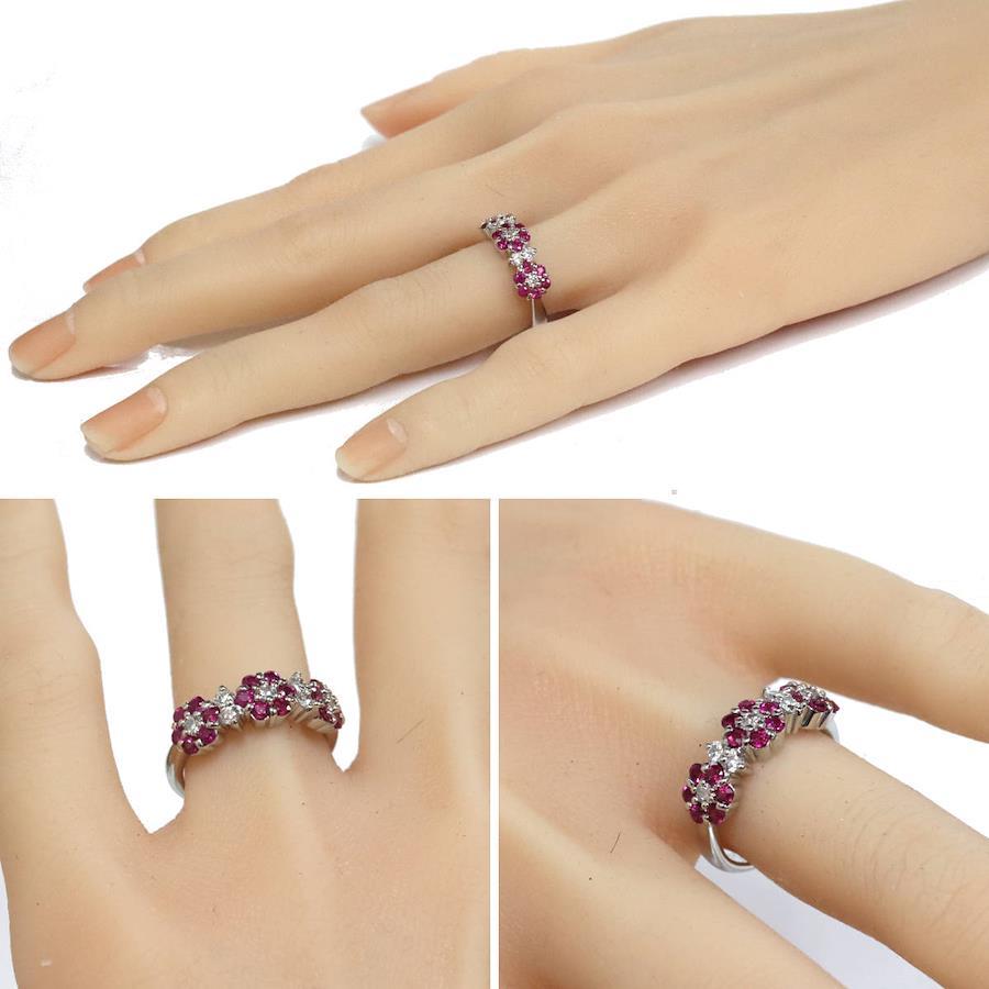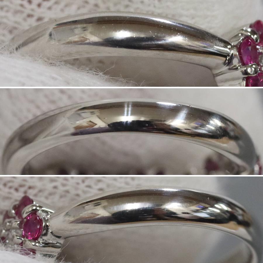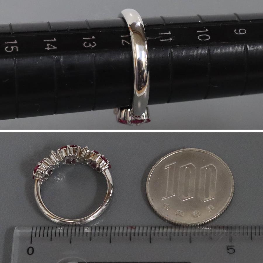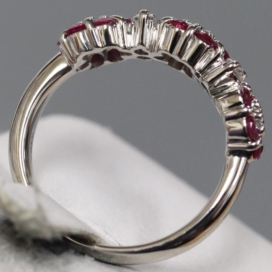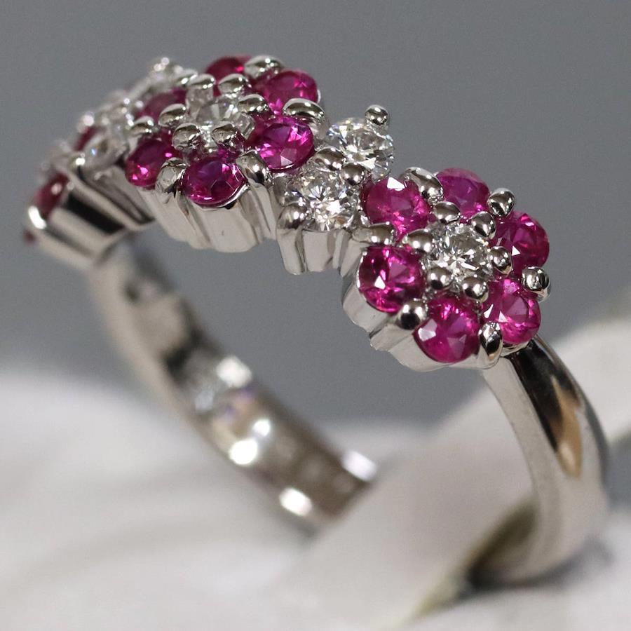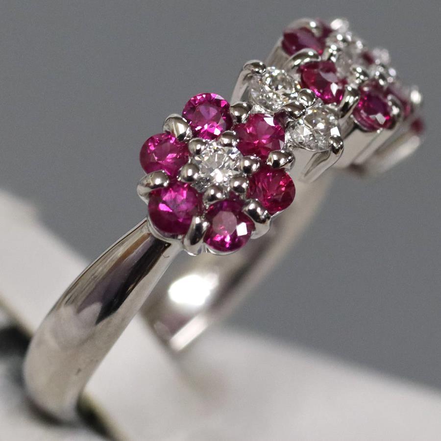 Pt900ルビーダイヤモンドリングの中古品です。フラワーモチーフのデザインです。ルビーは紫がかった赤色で、やや暗めの色味です。ダイヤモンドはインクルージョンが少なく、照りよく輝きます。地金にはわずかに小傷があります。+---+---+---+---+---+。{状態}A{素材}Pt900,ルビー,ダイヤモンド{サイズ}当店計測約#12{リング幅}約3-6mm。{その他}R0.83ct,D0.31ct,6.9g。{付属品}なし(サービス箱をお付けします){お問合せ商品番号}25106005+---+---+---+---+---+。