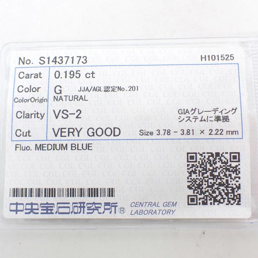 Product DetailsProduct Rank: NMaterial: Pt900 (Platinum)Diamond: 0.195Color: GClarity: VS-2Cut: Very GoodWeight: Approx. 0.5gSize: Approx. 4mm in lengthIncludes Central Gem Laboratory sortingProduct DetailsSimple earrings featuring beautiful, sparkling, high-quality diamonds.Brand new, unused