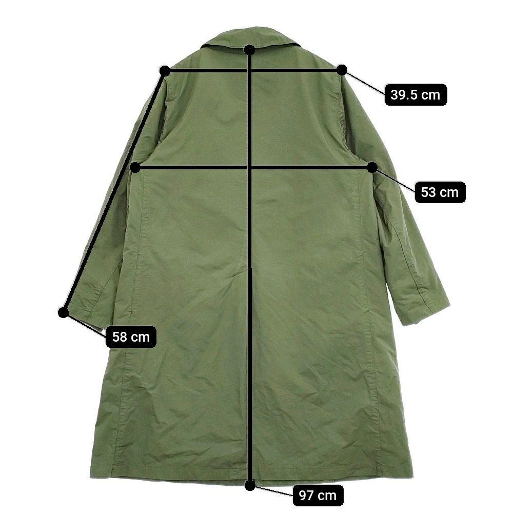 | 実寸サイズ | 肩幅:約39.5cm 着丈:約97cm 身幅:約53cm 袖丈:約58cm 備考 ライナー:肩幅:約35cm/袖丈:約58cm/身幅:約49.5cm/着丈:約72cm ※採寸画像がある商品はハンガーに吊るした状態での計測のため、平置きでの採寸とは差が生じる場合がございます。平置きでの実寸サイズをご希望の場合は、ご購入前に必ずご質問ください。 ※記載以外のサイズが合わないことを理由とした返品はできませんので、 記載部分以外で実寸サイズの気になる箇所があれば必ず購入前にご質問ください。 |