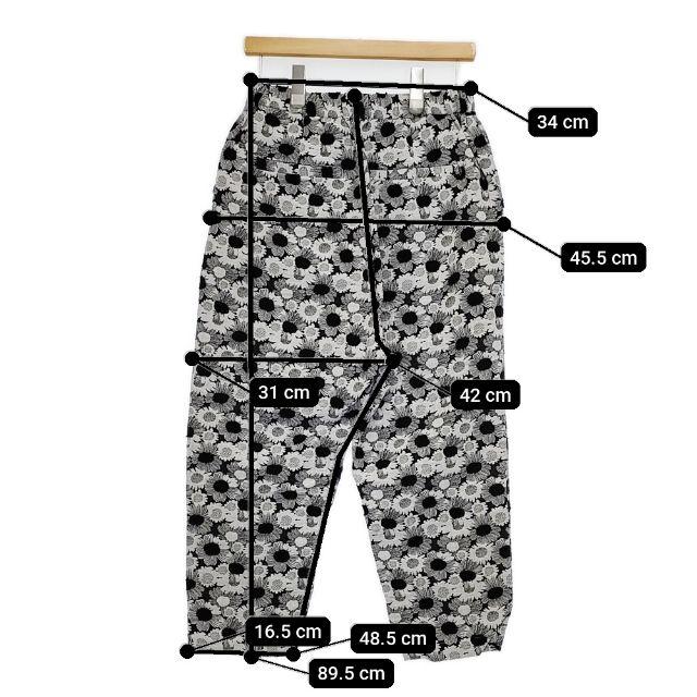 | 実寸サイズ | 総丈:約89.5cm ウエスト:約34cm ウエスト最長:約44cm 股上:約42cm 股下:約48.5cm ヒップ:約45.5cm ワタリ幅:約31cm 裾幅:約16.5cm ※採寸画像がある商品はハンガーに吊るした状態での計測のため、平置きでの採寸とは差が生じる場合がございます。平置きでの実寸サイズをご希望の場合は、ご購入前に必ずご質問ください。 ※記載以外のサイズが合わないことを理由とした返品はできませんので、 記載部分以外で実寸サイズの気になる箇所があれば必ず購入前にご質問ください。 |