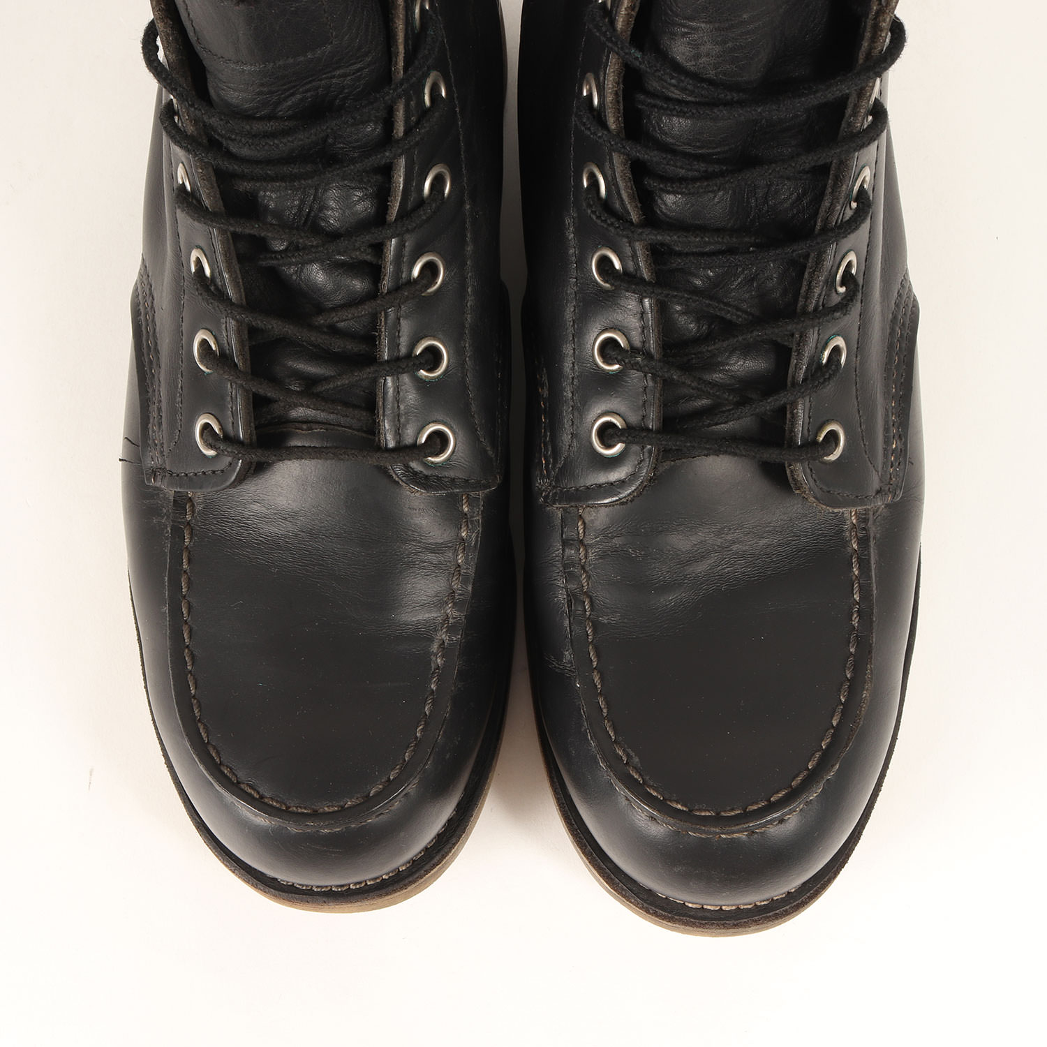 | 商品説明 | ・”刺繍羽タグ” ・ブラッククロームレザー ・モックトゥ ・トラクショントレッドソール ・オールアラウンドグッドイヤーウェルト製法 ・USA製 |