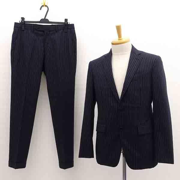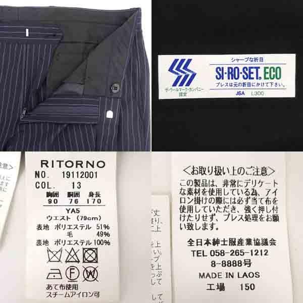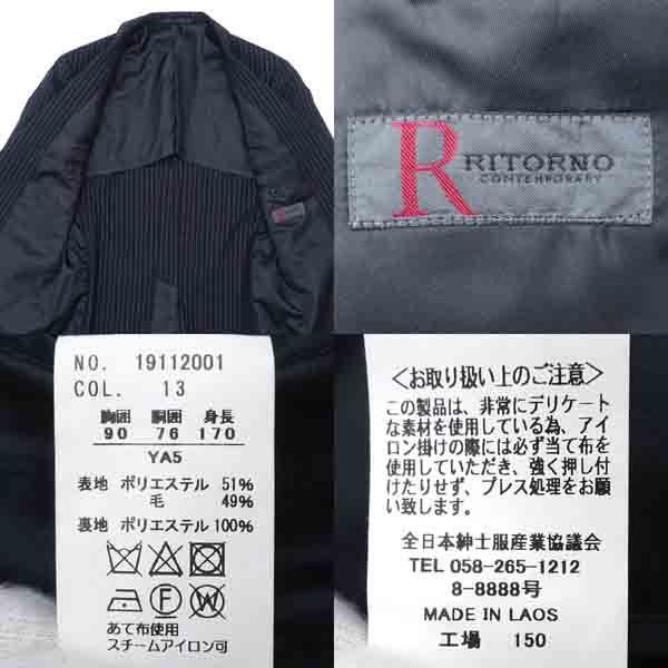 ・メーカー :RITORNO / リトルノ・サイズ :【上】:-,表記サイズ:YA5,肩幅 (約cm):42,身幅 (約cm):47,着丈 (約cm):70,袖丈 (約cm):60,【下】:-,表記サイズ:YA5,ウエスト (約cm):80,太腿幅 (約cm):28,股上 (約cm):23.5,股下 (約cm):70,裾幅 (約cm):17,・色(柄)の系統:ネイビー・デザイン :(メンズ)スーツ・素材 :ポリエステル51% ウール49%