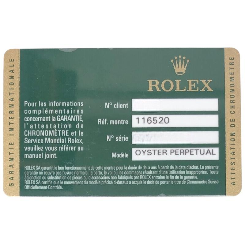 Brand: RolexModel: 116520Product name: DaytonaMaterial: Stainless steelDial color: BlackTarget: MenMovement: AutomaticCalendar type: Perpetual calendarWindshield material: Sapphire glassWater resistance: Waterproof to 100mFunction: ChronographWrist size: 18.5cmBand width: 1.7-1.9cmCase: 40mmCase shape: Round faceCase width: 40mmCase height: 40mmCase thickness: 12.2mmAccessories: Warranty card [The items shown in the accessories column and in the images are all accessories]Condition: PolishedAs this is an exhibition item, please understand that there may be slight scratches.
